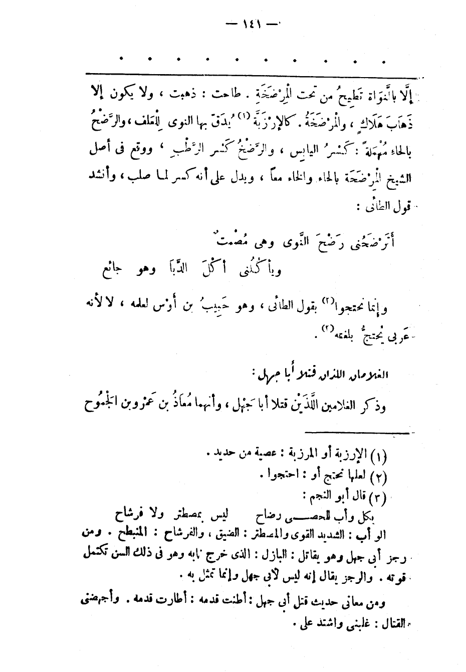 الو أب: الشديد القوى والمصطتر: الضيق، والفرشاح: المنبطح. ومن رجز أبى جهل وهو يقاتل: البازل: الذى خرج نابه وهو فى ذلك السن تكتمل قوته. والرجز يقال إنه ليس لأبى جهل وإنما تمثل به. ومن معانى حديث قتل أبى جهل: أطنت قدمه: أطارت قدمه. وأجهضنى القتال: غلبنى واشتد على.