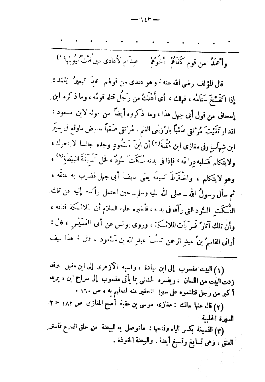لَقَدْ ارْتَقَيْت مُرْتَقًى صَعْبًا يَا رُوَيْعِي الْغَنَمِ. مُرْتَقًى صَعْبًا يُعَارِضُ مَا وَقَعَ فِي سَيْرِ ابْنِ شِهَابٍ وَفِي مَغَازِي ابْنِ عُقْبَةَ «2» أَنّ ابْنَ مَسْعُودٍ وَجَدَهُ جَالِسًا لَا يَتَحَرّكُ، وَلَا يَتَكَلّمُ فَسَلَبَهُ دِرْعَهُ، فَإِذَا فِي بَدَنِهِ نُكَتٌ سُودٌ، فَحَلّ تَسْبَغَةَ الْبَيْضَةِ «3» ، وَهُوَ لَا يَتَكَلّمُ، وَاخْتَرَطَ سَيْفُهُ يَعْنِي سَيْفَ أَبِي جَهْلٍ فَضَرَبَ بِهِ عُنُقَهُ، ثُمّ سَأَلَ رَسُولَ اللهِ- صَلّى اللهُ عَلَيْهِ وسلم- حين احْتَمَلَ رَأْسَهُ إلَيْهِ عَنْ تِلْكَ النّكَتِ السّودِ الّتِي رَآهَا فِي بَدَنِهِ، فَأَخْبَرَهُ عَلَيْهِ السّلَامُ أَنّ الْمَلَائِكَةَ قَتَلَتْهُ، وَأَنّ تِلْكَ آثَارُ ضَرْبَاتِ الْمَلَائِكَةِ، وَرَوَى يُونُسُ عَنْ أَبِي الْعُمَيْسِ، قَالَ: