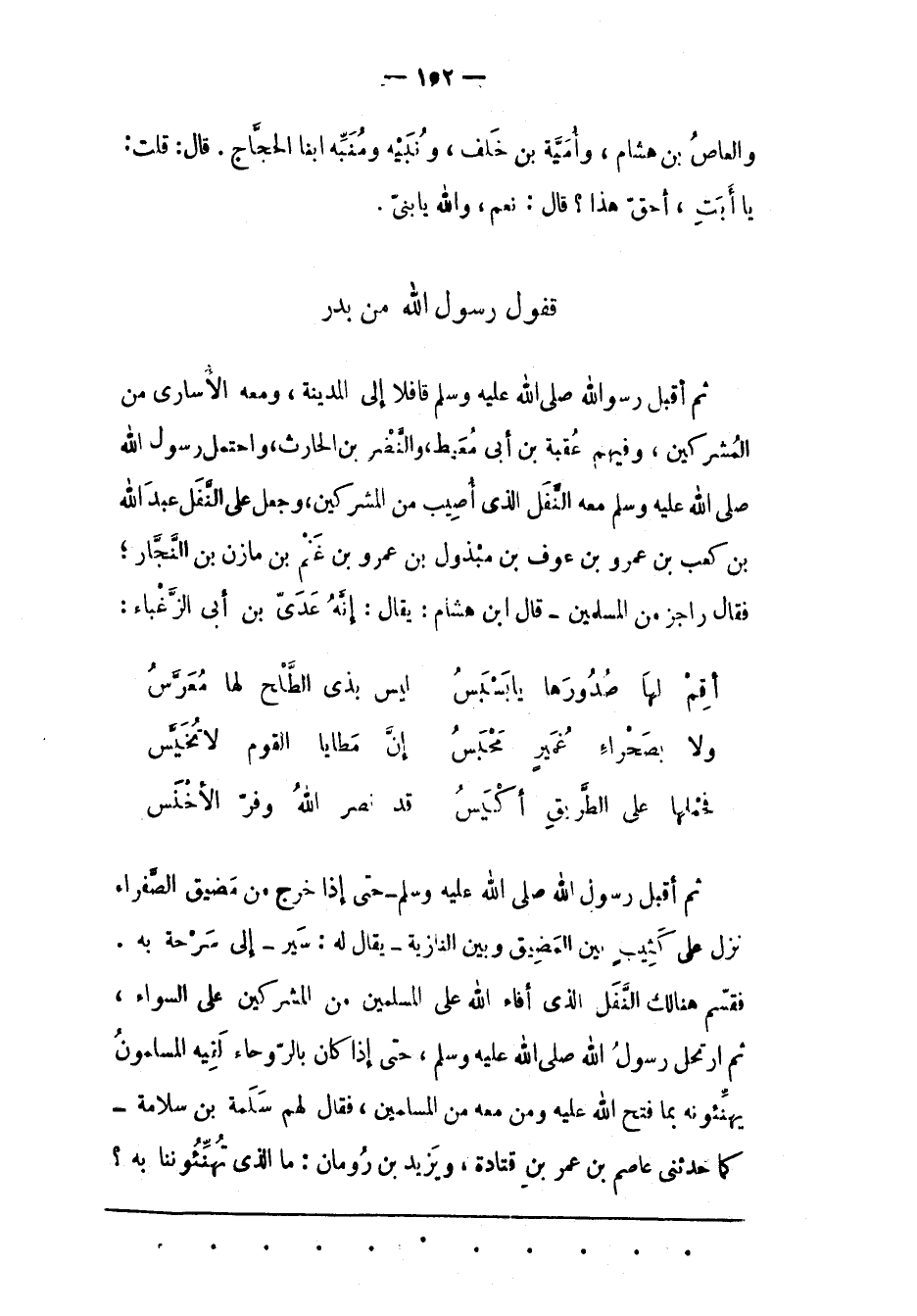 ثُمّ أَقْبَلَ رَسُولُ اللهِ صَلّى اللهُ عَلَيْهِ وَسَلّمَ قَافِلًا إلَى الْمَدِينَةِ، وَمَعَهُ الْأُسَارَى مِنْ الْمُشْرِكِينَ، وَفِيهِمْ عُقْبَةُ بْنُ أَبِي مُعَيْطٍ، وَالنّضْرُ بْنُ الْحَارِثِ، وَاحْتَمَلَ رَسُولُ اللهِ صَلّى اللهُ عَلَيْهِ وَسَلّمَ مَعَهُ النّفَلَ الّذِي أُصِيبَ مِنْ الْمُشْرِكِينَ، وَجَعَلَ عَلَى النّفَلِ عَبْدَ اللهِ بْنَ كَعْبِ بْنِ عَمْرِو بْنِ عَوْفِ بْنِ مَبْذُولِ بْنِ عَمْرِو بْن غَنْمِ بْنِ مَازِنِ بْنِ النّجّارِ؛ فَقَالَ رَاجِزٌ مِنْ الْمُسْلِمِينَ- قَالَ ابْنُ هِشَامٍ: يُقَال: إنّهُ عَدِيّ بْنُ أَبِي الزّغْبَاءِ: