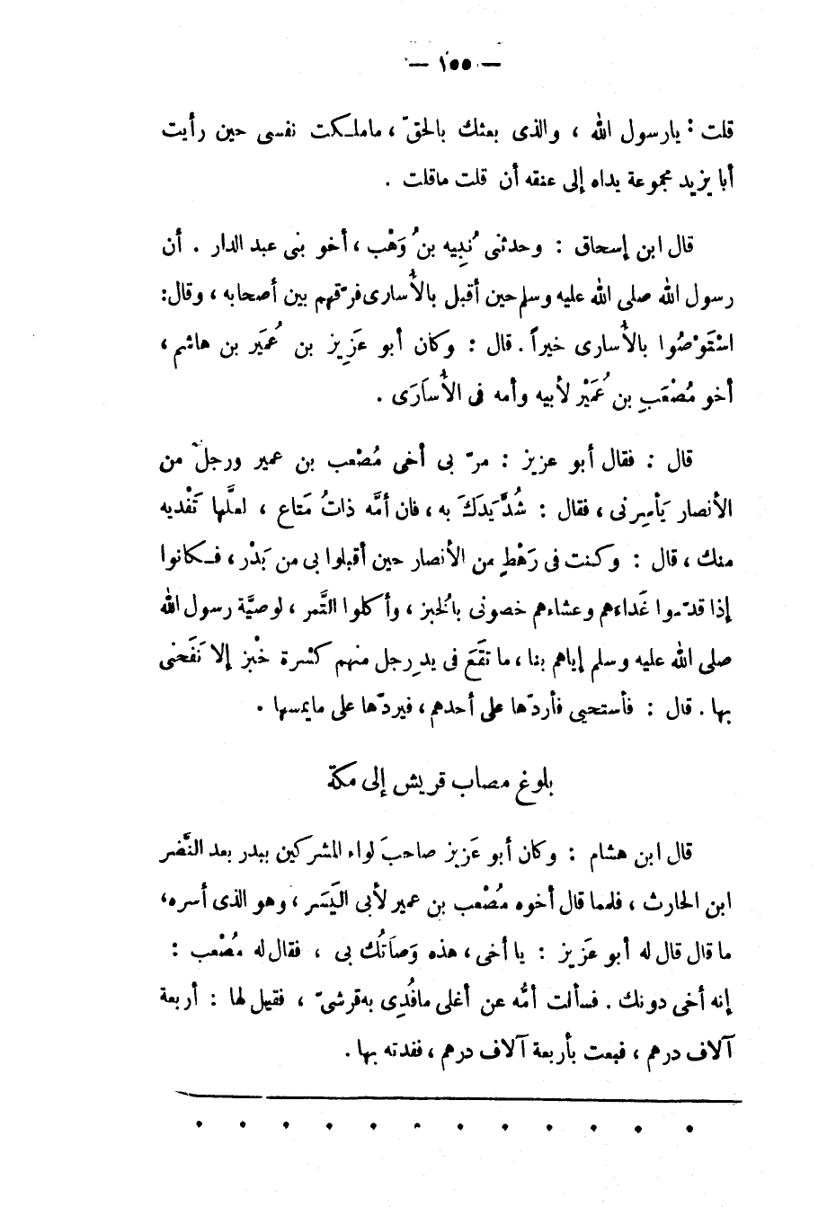 قَالَ ابْنُ إسْحَاقَ: وَحَدّثَنِي نُبِيّهُ بْنُ وَهْبٍ، أَخُو بَنِي عَبْدِ الدّارِ. أَنّ رَسُولَ اللهِ صَلّى اللهُ عَلَيْهِ وَسَلّمَ حِينَ أَقْبَلَ بِالْأُسَارَى فَرّقَهُمْ بَيْنَ أَصْحَابِهِ، وَقَالَ: