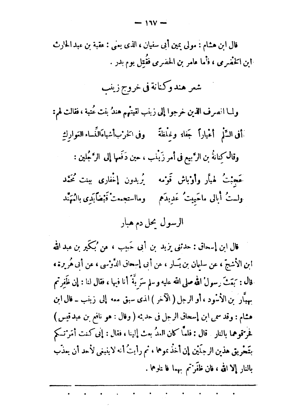 قَالَ ابْنُ إسْحَاقَ: حَدّثَنِي يَزِيدُ بْنُ أَبِي حَبِيبٍ، عَنْ بُكَيْرِ بن عبد الله ابن الْأَشَجّ، عَنْ سُلَيْمَانَ بْنِ يَسَارٍ، عَنْ أَبِي إسْحَاقَ الدّوْسِيّ، عَنْ أَبِي هُرَيْرَةَ، قَالَ: بَعَثَ رَسُولُ اللهِ صَلّى اللهُ عَلَيْهِ وَسَلّمَ سَرِيّةً أَنَا فِيهَا، فَقَالَ لَنَا: إنْ ظَفِرْتُمْ بِهَبّارِ بْنِ الْأَسْوَدِ، أَوْ الرّجُلِ (الْآخَرِ) الّذِي سَبَقَ مَعَهُ إلَى زَيْنَبَ- قَالَ ابْنُ هِشَامٍ: وَقَدْ سَمّى ابْنُ إسْحَاقَ الرّجُلَ فِي حَدِيثِهِ (وَقَالَ: هُوَ نَافِعُ بْنُ عَبْدِ قَيْسٍ) فَحَرّقُوهُمَا بِالنّارِ. قَالَ: فَلَمّا كَانَ الْغَدُ بَعَثَ إلَيْنَا، فَقَالَ: إنّي كُنْت أَمَرْتُكُمْ بِتَحْرِيقِ هَذَيْنِ الرّجُلَيْنِ إنْ أَخَذْتُمُوهُمَا، ثُمّ رَأَيْتُ أَنّهُ لَا يَنْبَغِي لِأَحَدٍ أَنْ يُعَذّبَ بِالنّارِ إلّا اللهُ، فَإِنْ ظَفَرْتُمْ بهما فاقتلوهما.