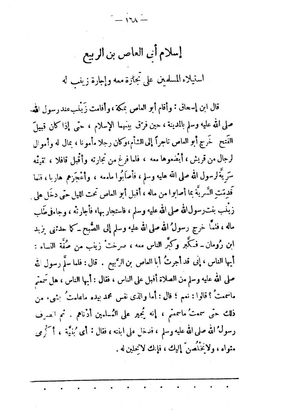 قَالَ ابْنُ إسْحَاقَ: وَأَقَامَ أَبُو الْعَاصِ بِمَكّةَ، وَأَقَامَتْ زَيْنَبُ عِنْدَ رَسُولِ اللهِ صَلَّى اللَّهُ عَلَيْهِ وَسَلَّمَ بِالْمَدِينَةِ، حِينَ فَرّقَ بَيْنَهُمَا الْإِسْلَامُ، حَتّى إذَا كَانَ قُبَيْلَ الْفَتْحِ خَرَجَ أَبُو الْعَاصِ تَاجِرًا إلَى الشّامِ، وَكَانَ رَجُلًا مَأْمُونًا، بِمَالٍ لَهُ وَأَمْوَالٍ لِرِجَالٍ مِنْ قُرَيْشٍ، أَبْضَعُوهَا مَعَهُ، فَلَمّا فَرَغَ مِنْ تِجَارَتِهِ وَأَقْبَلَ قَافِلًا، لَقِيَتْهُ سَرِيّةٌ لِرَسُولِ اللهِ صَلّى اللهُ عَلَيْهِ وَسَلّمَ، فَأَصَابُوا مَا مَعَهُ، وَأَعْجَزَهُمْ هَارِبًا، فَلَمّا قَدِمَتْ السّرِيّةُ بِمَا أَصَابُوا مِنْ مَالِهِ، أَقْبَلَ أَبُو الْعَاصِ تَحْتَ اللّيْلِ حَتّى دَخَلَ عَلَى زينب بنت رسول الله صلى الله عليه وَسَلّمَ، فَاسْتَجَارَ بِهَا، فَأَجَارَتْهُ، وَجَاءَ فِي طَلَبِ مَالِهِ، فَلَمّا خَرَجَ رَسُولُ اللهِ صَلَّى اللَّهُ عَلَيْهِ وَسَلَّمَ إلَى الصّبْحِ- كَمَا حَدّثَنِي يَزِيدُ ابن رومان- فكّبر وكبّر الناس معه، صرخت زينب من صفّة النّسَاءِ: