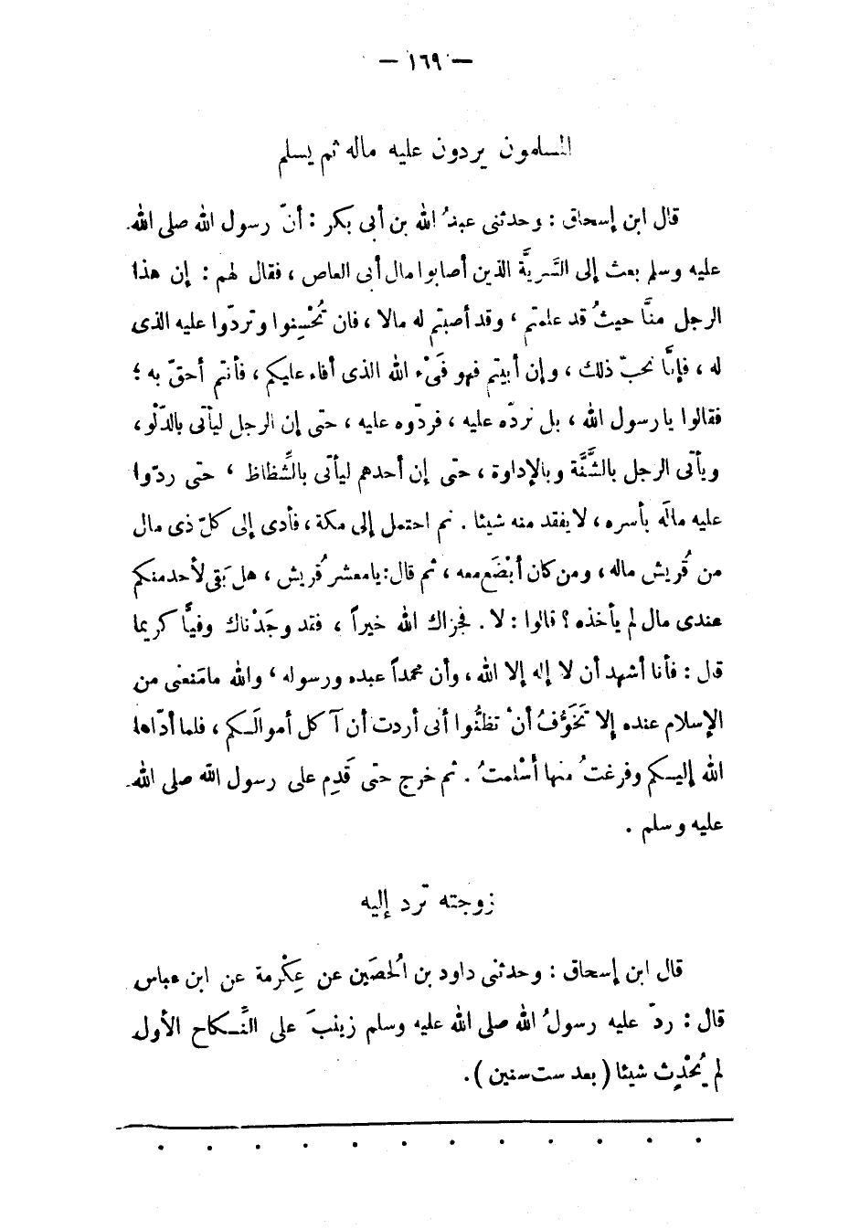 قال ابن إسحاق: وحدثني دَاوُدَ بْنِ الْحُصَيْنِ عَنْ عِكْرِمَةَ عَنْ ابْنِ عباس قال: رَدّ عَلَيْهِ رَسُولُ اللهِ صَلَّى اللَّهُ عَلَيْهِ وَسَلَّمَ زَيْنَبَ عَلَى النّكَاحِ الْأَوّلِ لَمْ يُحْدِثْ شَيْئًا (بَعْدَ سِتّ سِنِينَ) .