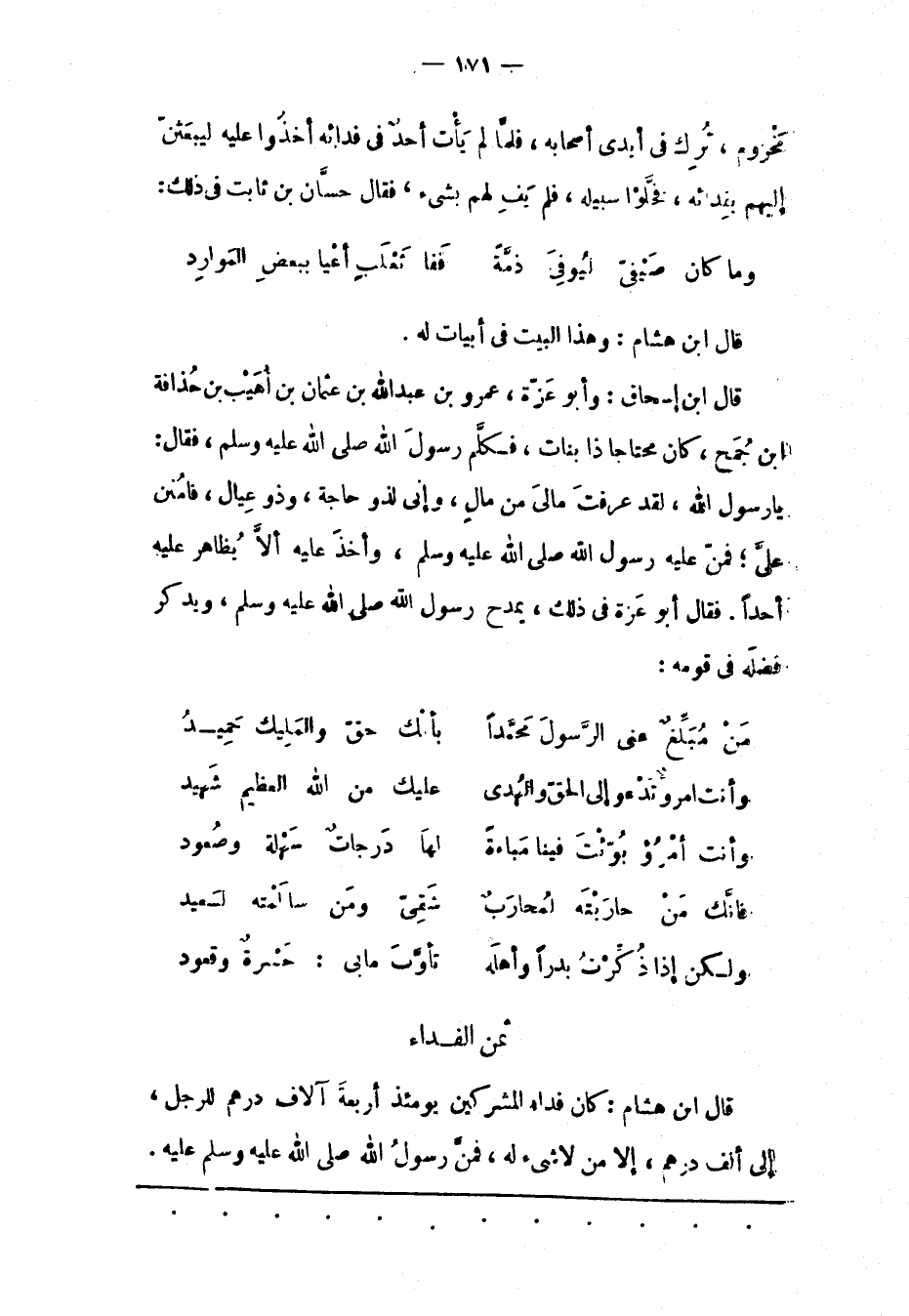 قَالَ ابْنُ هِشَامٍ: كَانَ فِدَاءُ الْمُشْرِكِينَ يَوْمَئِذٍ أَرْبَعَةَ آلَافِ دِرْهَمٍ لِلرّجُلِ، إلَى أَلْفِ دِرْهَمٍ، إلّا مَنْ لَا شَيْءَ لَهُ، فَمَنّ رَسُولُ اللهِ صَلّى اللهُ عَلَيْهِ وَسَلّمَ عليه.