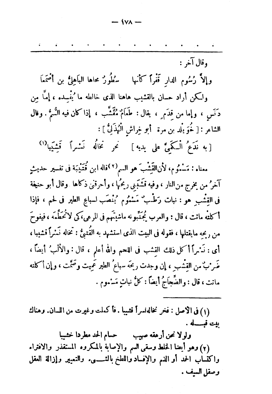 مَعْنَاهُ: مَسْمُومٌ، لِأَنّ الْقَشْبَ هُوَ السّمّ «2» قَالَهُ ابْنُ قُتَيْبَةَ فِي تَفْسِيرِ حَدِيثِ آخِرُ مَنْ يَخْرَجُ مِنْ النّارِ، وَفِيهِ قَشَبَنِي رِيحُهَا، وَأَحْرَقَنِي ذَكَاهَا وَقَالَ أَبُو حَنِيفَةَ فِي الْقِشْبِ هُوَ: نَبَاتٌ رَطْبٌ مَسْمُومٌ يُنْصَبُ لِسِبَاعِ الطّيْرِ فِي لَحْمٍ، فَإِذَا أَكَلَتْهُ مَاتَتْ، قَالَ: وَالْعَرَبُ يُجْنِبُونَهُ ما شيتهم فِي الْمَرْعَى، كَيْ لَا تُحَطّمَهُ، فَيَفُوحُ مِنْ رِيحِهِ مَا يَقْتُلُهَا، فَقَوْلُهُ فِي الْبَيْتِ الّذِي اسْتَشْهَدَ بِهِ الْقُتَبِيّ: تَخَالُهُ نَسْرًا قَشِيبًا، أَيْ: نَسْرًا أَكَلَ ذَلِكَ الْقِشْبَ فِي اللّحْمِ وَاَللهُ أَعْلَمُ، قَالَ: وَالْأَلْبُ أَيْضًا، ضَرْبٌ مِنْ الْقِشْبِ، إن وجدت ريحه سباع الطير غميت وَصَمّتْ، وَإِنْ أَكَلَتْهُ مَاتَتْ، قَالَ: وَالضّجَاجُ أَيْضًا: كلّ نبات مسموم.