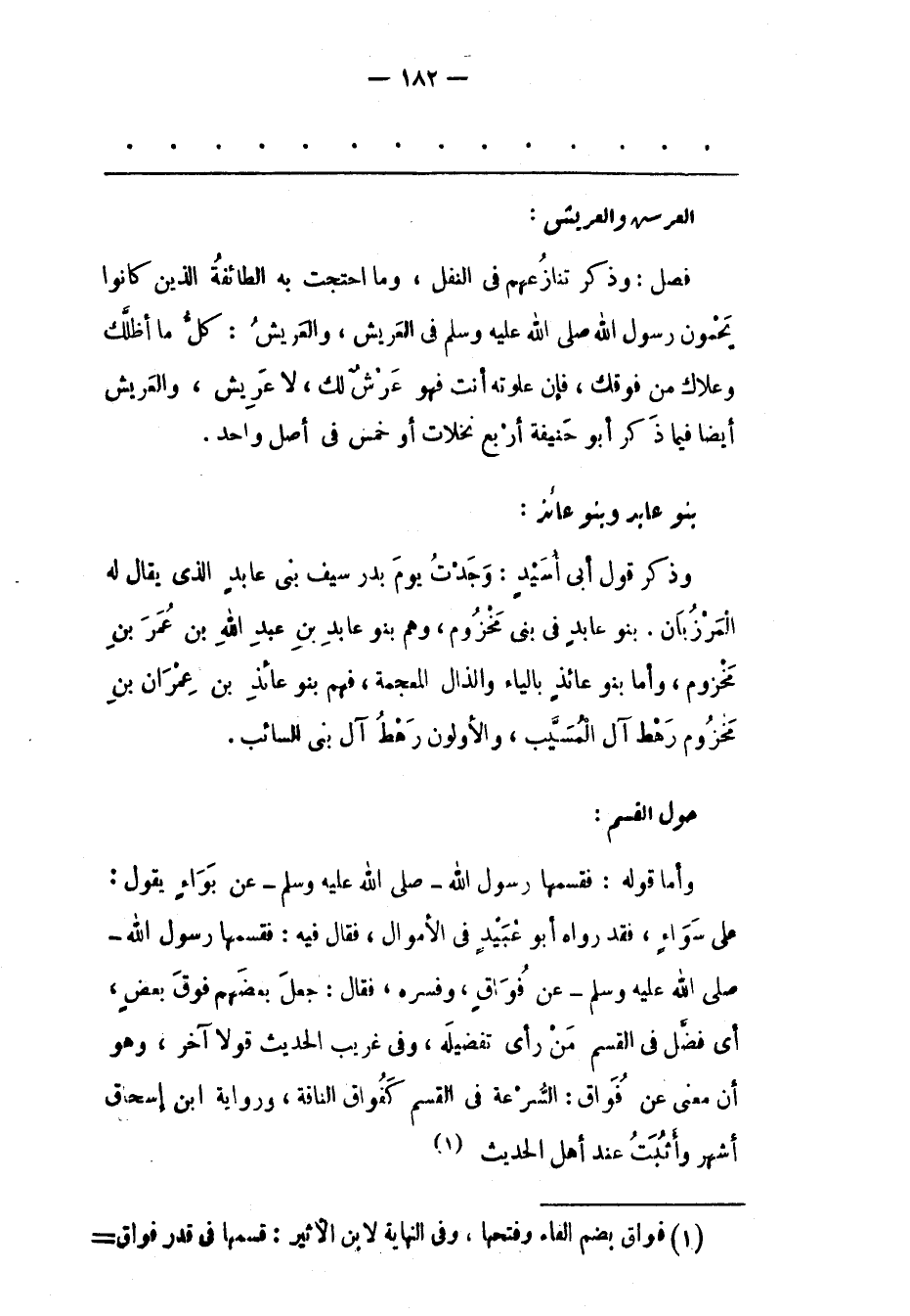 فَصْلٌ: وَذَكَرَ تَنَازُعَهُمْ فِي النّفْلِ، وَمَا احْتَجّتْ بِهِ الطّائِفَةُ الّذِينَ كَانُوا يَحْمُونَ رَسُولَ اللهِ صَلَّى اللَّهُ عَلَيْهِ وَسَلَّمَ فِي الْعَرِيشِ، وَالْعَرِيشُ: كُلّ مَا أَظَلّك وَعَلَاك مِنْ فَوْقِك، فَإِنْ عَلَوْته أَنْتَ فَهُوَ عَرْشٌ لَك، لَا عريش، والعريش أيضا فيما ذكر أَبُو حَنِيفَةَ أَرْبَعُ نَخَلَاتٍ أَوْ خَمْسٌ فِي أَصْلٍ وَاحِدٍ.