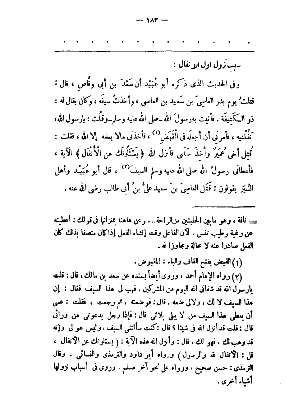 (2) رواه الإمام أحمد، وروى أيضا بسنده عن سعد بن مالك، قال: قلت يا رسول الله قد شفانى الله اليوم من المشركين، فهب لى هذا السيف فقال: إن هذا السيف لا لك، ولالى ضعه. قال: فوضعته، ثم رجعت، فقلت: عسى أن يعطى هذا السيف من لا يبلى بلائى قال: فإذا رجل يدعونى من ورائى قال: قلت قد أنزل الله فى شيئا؟ قال: كنت سألتنى السيف، وليس هو لى وإنه قد وهب لك، فهو لك، قال: وأنزل الله هذه الآية: يَسْئَلُونَكَ عَنِ الْأَنْفالِ، قُلِ: الْأَنْفالُ لِلَّهِ وَالرَّسُولِ ورواه أبو داود والترمذى والنسائى. وقال الترمذى: حسن صحيح، ورواه على نحو آخر مسلم. وروى فى أسباب نزولها أشياء أخرى.