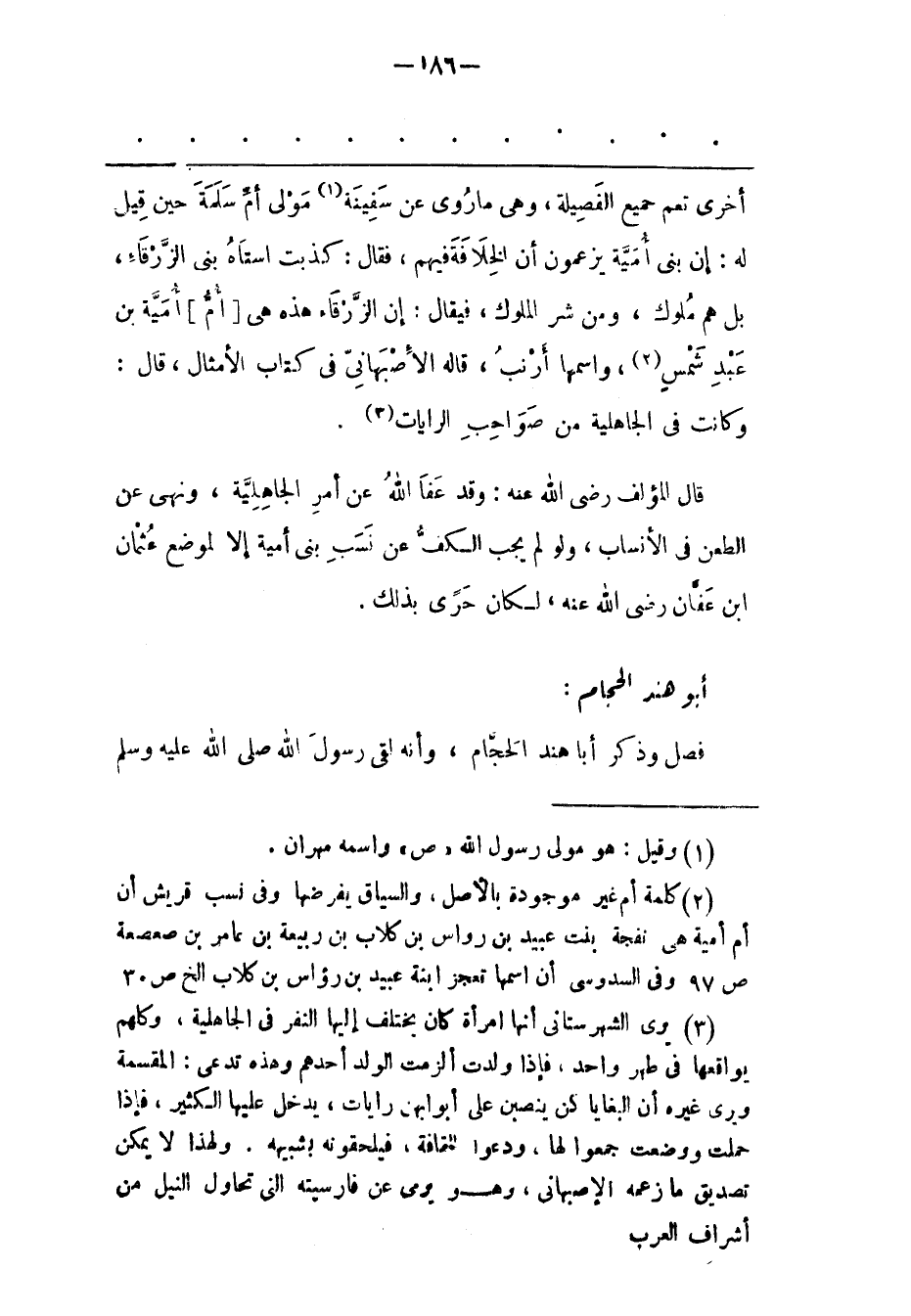 (2) كلمة أم غير موجودة بالأصل، والسياق يفرضها وفى نسب قريش أن أم أمية هى نفجة بنت عبيد بن رواس بْنِ كِلَابِ بْنِ رَبِيعَةَ بْنِ عَامِرِ بْنِ صعصعة ص 97 وفى السدوسى أن اسمها تعجز ابنة عبيد بن رؤاس بن كلاب الخ ص 30