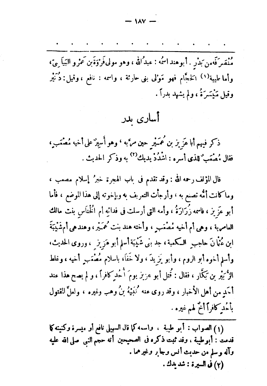 أُسَارَى بَدْرٍ ذَكَرَ فِيهِمْ أَبَا عزيز بن عمير حين مرّبه، وَهُوَ أَسِيرٌ عَلَى أَخِيهِ مُصْعَبٍ، فَقَالَ مُصْعَبٌ لِلّذِي أَسَرَهُ: اُشْدُدْ يَدَيْك «2» بِهِ وَذَكَرَ الْحَدِيثَ.