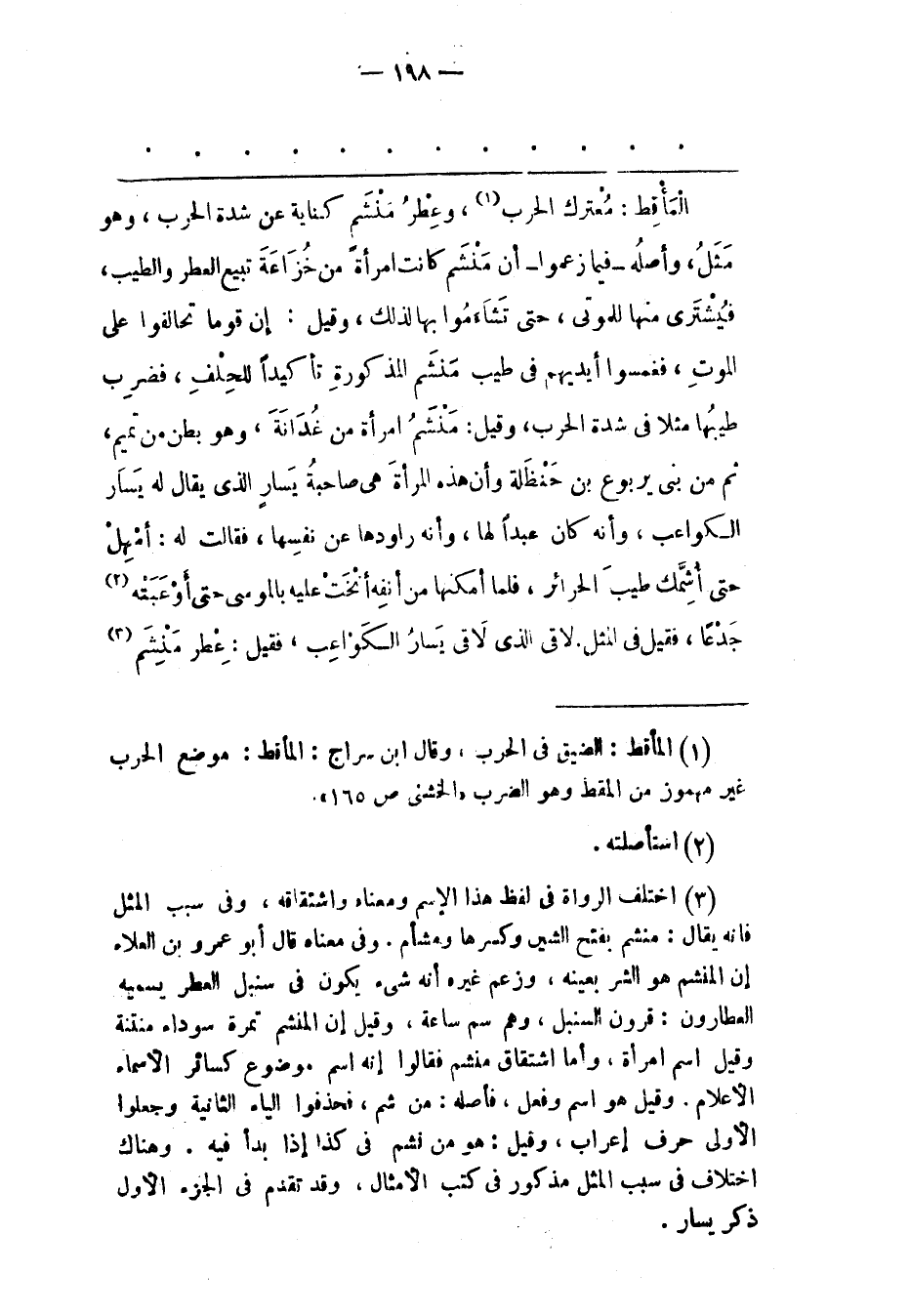 (3) اختلف الرواة فى لفظ هذا الإسم ومعناه واشتقاقه، وفى سبب المثل فانه يقال: منشم بفتح الشين وكسرها ومشأم. وفى معناه قال أبو عمرو بن العلاء إن المنشم هو الشر بعينه، وزعم غيره أنه شىء يكون فى سنبل العطر يسميه العطارون: قرون السنبل، وهم سم ساعة، وقيل إن المنشم تمرة سوداء منتنة وقيل اسم امرأة، وأما اشتقاق منشم فقالوا إنه اسم موضوع كسائر الأسماء الأعلام. وقيل هو اسم وفعل، فأصله: من شم، فحذفوا الياء الثانية وجعلوا الأولى حرف إعراب، وقيل: هو من لشم فى كذا إذا بدأ فيه. وهناك اختلاف فى سبب المثل مذكور فى كتب الأمثال، وقد تقدم فى الجزء الأول ذكر يسار.