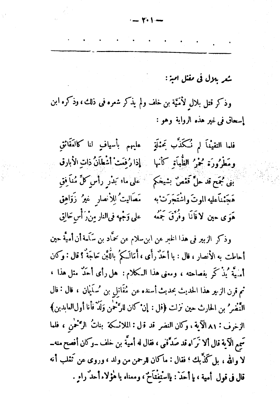 وَذَكَرَ قَتْلَ بِلَالٍ لِأُمَيّةِ بْنِ خَلَفٍ وَلَمْ يَذْكُرْ شِعْرَهُ فِي ذَلِكَ، وَذَكَرَهُ ابْنُ إسْحَاقَ فِي غَيْرِ هَذِهِ الرّوَايَةِ وَهُوَ: