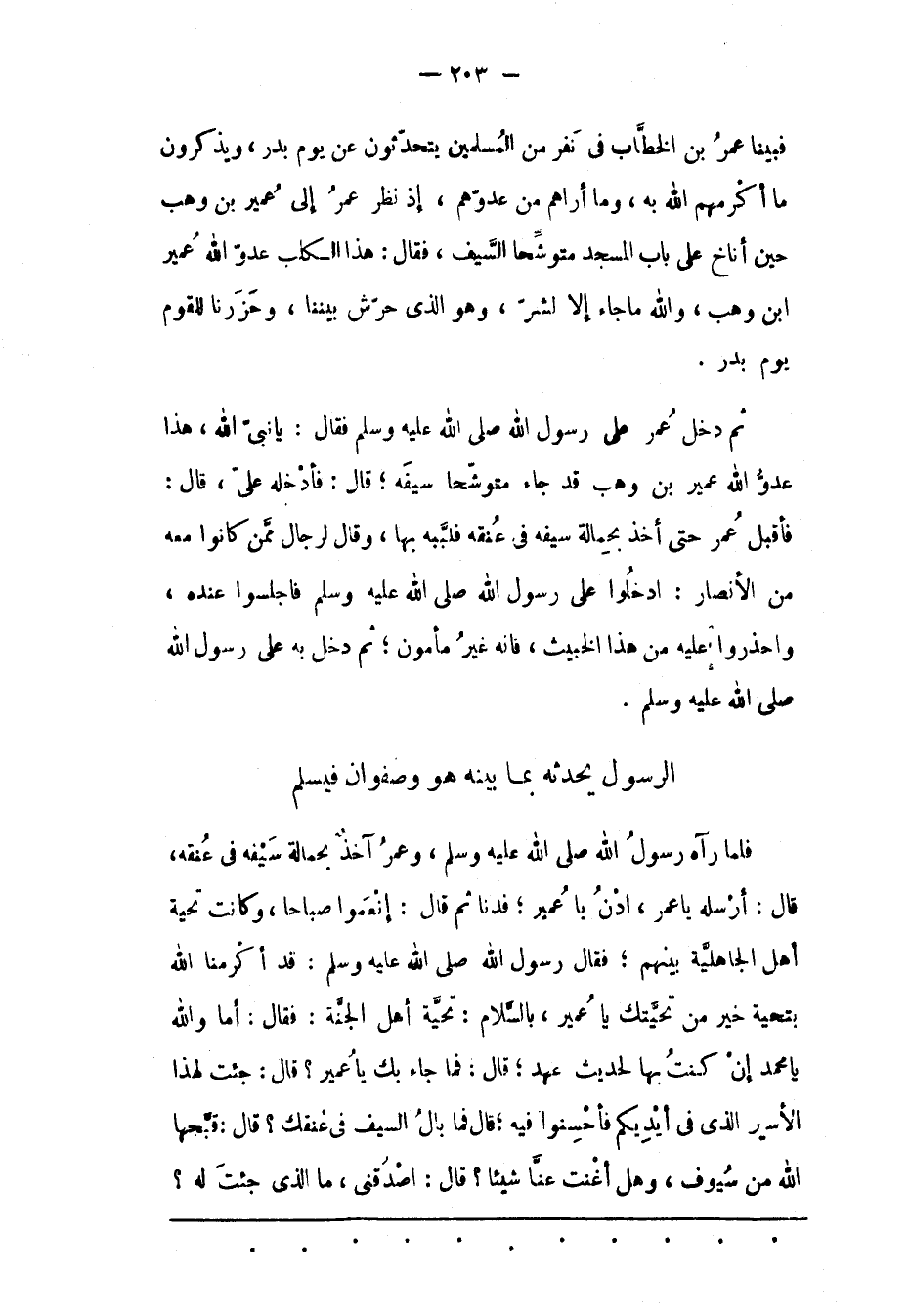 ثُمّ دَخَلَ عُمَرُ عَلَى رَسُولِ اللهِ صَلَّى اللَّهُ عَلَيْهِ وَسَلَّمَ فَقَالَ: يَا نَبِيّ اللهِ، هذا عدوّ الله عمير بن وهب قد جاء متوشّحا سيفه؛ قَالَ: فَأَدْخَلَهُ عَلَيّ، قَالَ: