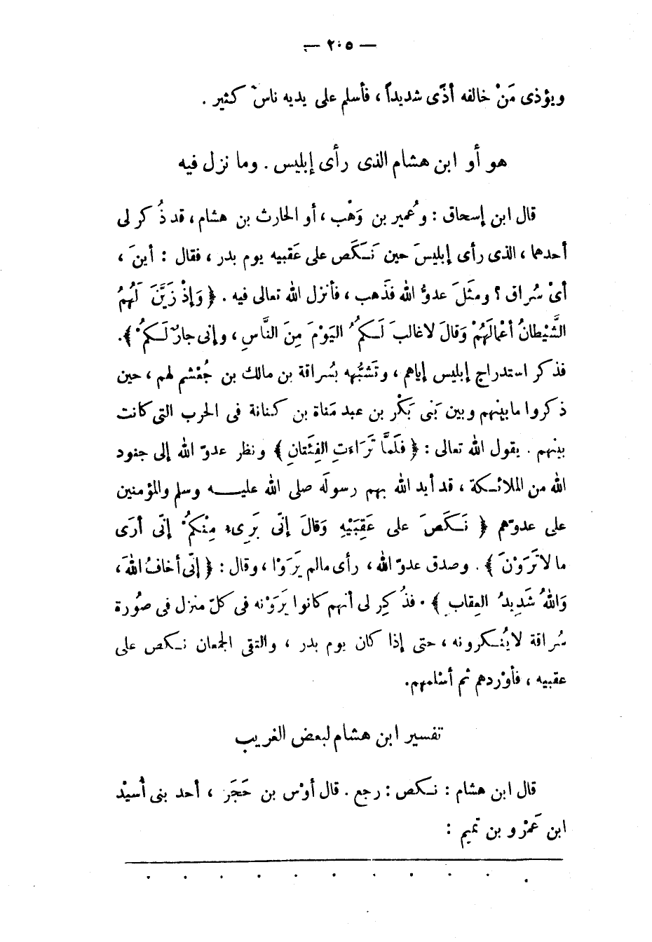 قَالَ ابْنُ إسْحَاقَ: وَعُمَيْرُ بْنُ وَهْبٍ، أَوْ الْحَارِثُ بْنُ هِشَامٍ، قَدْ ذُكِرَ لِي أَحَدُهُمَا، الّذِي رَأَى إبْلِيسَ حِينَ نَكَصَ عَلَى عَقِبَيْهِ يوم بدر، فقال: أين، أى سراق؟ وَمَثَلَ عَدُوّ اللهِ فَذَهَبَ، فَأَنْزَلَ اللهُ تَعَالَى فِيهِ. وَإِذْ زَيَّنَ لَهُمُ الشَّيْطانُ أَعْمالَهُمْ وَقالَ لَا غالِبَ لَكُمُ الْيَوْمَ مِنَ النَّاسِ، وَإِنِّي جارٌ لَكُمْ.