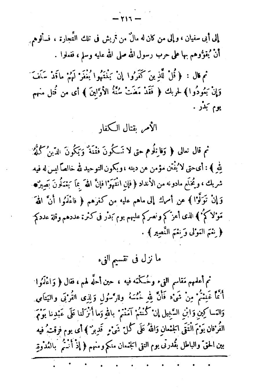 ثُمّ أَعْلَمَهُمْ مَقَاسِمَ الْفَيْءِ وَحُكْمَهُ فِيهِ، حِينَ أَحَلّهُ لَهُمْ، فَقَالَ وَاعْلَمُوا أَنَّما غَنِمْتُمْ مِنْ شَيْءٍ فَأَنَّ لِلَّهِ خُمُسَهُ وَلِلرَّسُولِ وَلِذِي الْقُرْبى وَالْيَتامى وَالْمَساكِينِ وَابْنِ السَّبِيلِ إِنْ كُنْتُمْ آمَنْتُمْ بِاللَّهِ وَما أَنْزَلْنا عَلى عَبْدِنا يَوْمَ الْفُرْقانِ يَوْمَ الْتَقَى الْجَمْعانِ وَاللَّهُ عَلى كُلِّ شَيْءٍ قَدِيرٌ أَيْ يَوْمَ فَرّقْتُ فِيهِ بَيْنَ الْحَقّ وَالْبَاطِلِ بِقُدْرَتِي يَوْمَ الْتَقَى الْجَمْعَانِ مِنْكُمْ وَمِنْهُمْ إِذْ أَنْتُمْ بِالْعُدْوَةِ