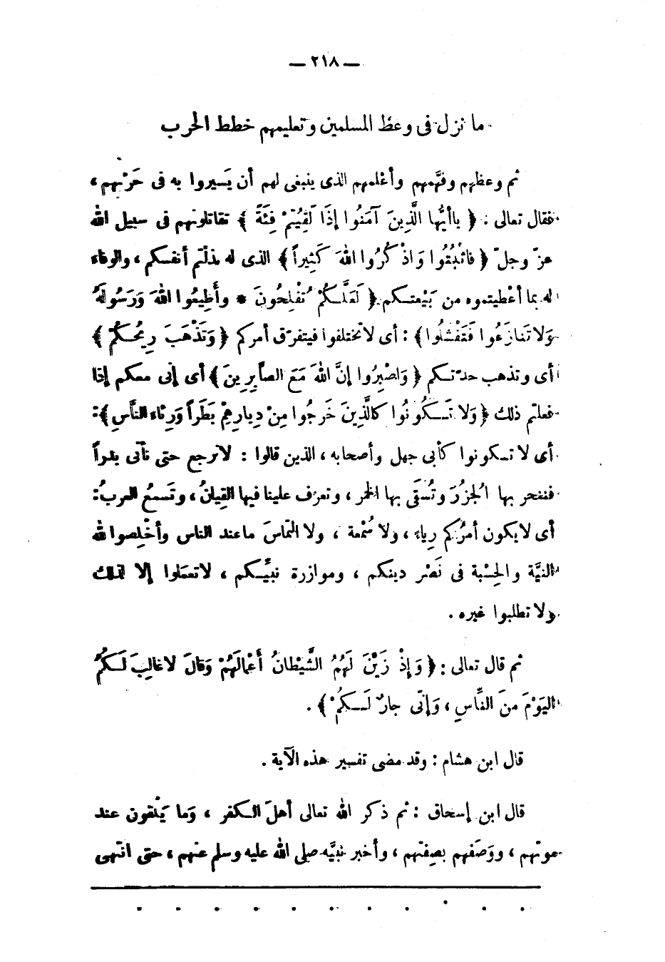 ثُمّ وَعَظَهُمْ وَفَهّمَهُمْ وَأَعْلَمَهُمْ الّذِي يَنْبَغِي لَهُمْ أَنْ يَسِيرُوا بِهِ فِي حَرْبِهِمْ، فَقَالَ تَعَالَى: يَا أَيُّهَا الَّذِينَ آمَنُوا إِذا لَقِيتُمْ فِئَةً تُقَاتِلُونَهُمْ فِي سَبِيل اللهِ عَزّ وَجَلّ فَاثْبُتُوا وَاذْكُرُوا اللَّهَ كَثِيراً الذى له مذلتم أَنْفُسَكُمْ، وَالْوَفَاءَ لَهُ بِمَا أَعْطَيْتُمُوهُ مِنْ بَيْعَتِكُمْ لَعَلَّكُمْ تُفْلِحُونَ. وَأَطِيعُوا اللَّهَ وَرَسُولَهُ وَلا تَنازَعُوا فَتَفْشَلُوا: أَيْ لَا تَخْتَلِفُوا فَيَتَفَرّقَ أَمْرُكُمْ وَتَذْهَبَ رِيحُكُمْ أَيْ وَتَذْهَبَ حِدّتُكُمْ وَاصْبِرُوا إِنَّ اللَّهَ مَعَ الصَّابِرِينَ أَيْ إنّي مَعَكُمْ إذَا فَعَلْتُمْ ذَلِكَ وَلا تَكُونُوا كَالَّذِينَ خَرَجُوا مِنْ دِيارِهِمْ بَطَراً وَرِئاءَ النَّاسِ: