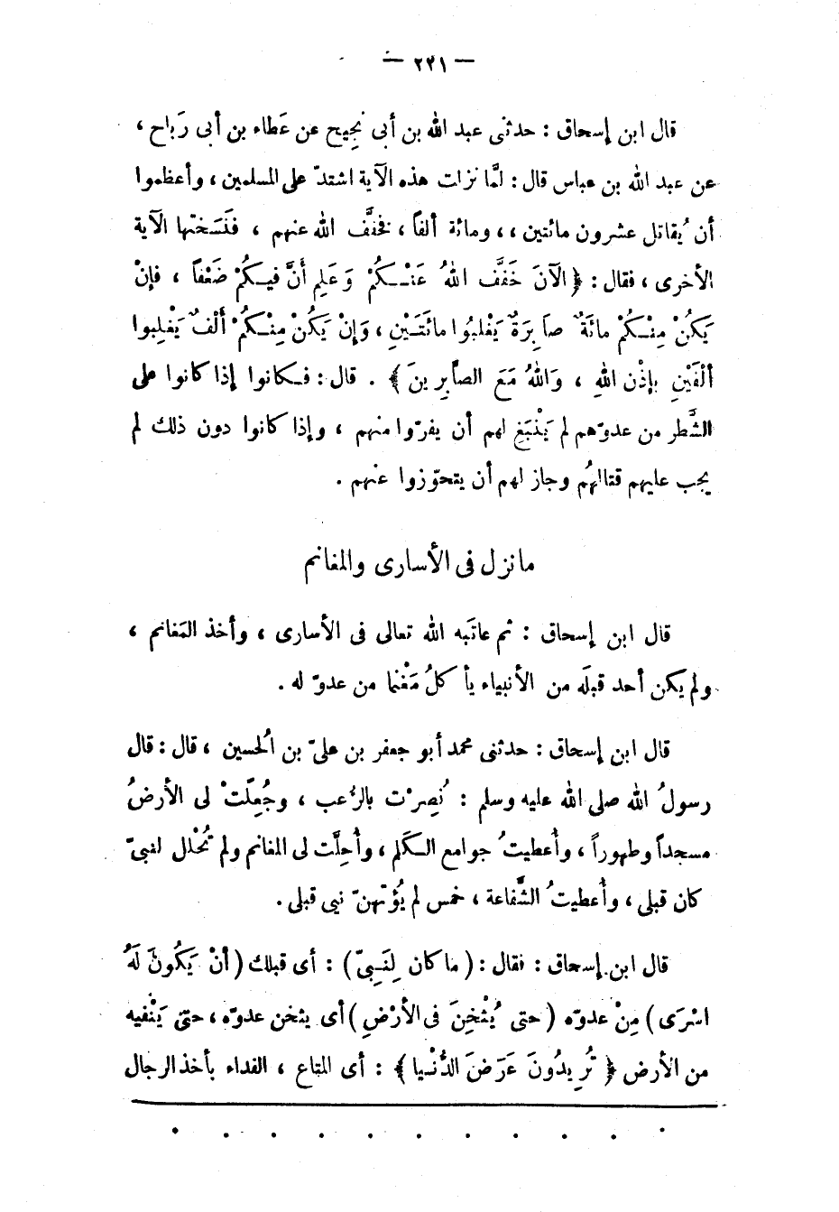 قَالَ ابْنُ إسْحَاقَ: حَدّثَنِي عَبْدُ اللهِ بْنُ أَبِي نَجِيحٍ عَنْ عَطَاءِ بْنِ أَبِي رَبَاحٍ، عن عَبْدِ اللهِ بْنِ عَبّاسٍ قَالَ: لَمّا نَزَلَتْ هذه الْآيَةُ اشْتَدّ عَلَى الْمُسْلِمِينَ، وَأَعْظَمُوا أَنْ يُقَاتِلَ عشرون مائتين، ومائة أَلْفًا، فَخَفّفَ اللهُ عَنْهُمْ، فَنَسَخَتْهَا الْآيَةُ الْأُخْرَى، فَقَالَ: الْآنَ خَفَّفَ اللَّهُ عَنْكُمْ وَعَلِمَ أَنَّ فِيكُمْ ضَعْفاً، فَإِنْ يَكُنْ مِنْكُمْ مِائَةٌ صابِرَةٌ يَغْلِبُوا مِائَتَيْنِ، وَإِنْ يَكُنْ مِنْكُمْ أَلْفٌ يَغْلِبُوا أَلْفَيْنِ بِإِذْنِ اللَّهِ، وَاللَّهُ مَعَ الصَّابِرِينَ. قَالَ: فَكَانُوا إذَا كَانُوا عَلَى الشّطْرِ مِنْ عَدُوّهِمْ لَمْ يَنْبَغِ لَهُمْ أَنْ يَفِرّوا مِنْهُمْ، وَإِذَا كَانُوا دُونَ ذَلِكَ لَمْ يَجِبْ عَلَيْهِمْ قِتَالُهُمْ وَجَازَ لَهُمْ أَنْ يَتَحَوّزُوا عَنْهُمْ.