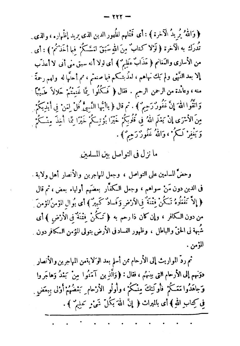وَحَضّ الْمُسْلِمِينَ عَلَى التّوَاصُلِ، وَجَعَلَ الْمُهَاجِرِينَ وَالْأَنْصَارَ أَهْلَ وِلَايَةٍ فِي الدّينِ دُونَ مَنْ سِوَاهُمْ، وَجَعَلَ الْكُفّارَ بَعْضَهُمْ أَوْلِيَاءُ بَعْضٍ، ثُمّ قَالَ إِلَّا تَفْعَلُوهُ تَكُنْ فِتْنَةٌ فِي الْأَرْضِ وَفَسادٌ كَبِيرٌ أى يُوَالِ الْمُؤْمِنُ الْمُؤْمِنَ مِنْ دُونِ الْكَافِرِ، وَإِنْ كَانَ ذَا رَحِمٍ بِهِ تَكُنْ فِتْنَةٌ فِي الْأَرْضِ أَيْ شُبْهَةٌ فِي الْحَقّ وَالْبَاطِلِ، وَظُهُورِ الْفَسَادِ فِي الْأَرْضِ بِتَوَلّي الْمُؤْمِنِ الْكَافِرَ دُونَ الْمُؤْمِنِ.