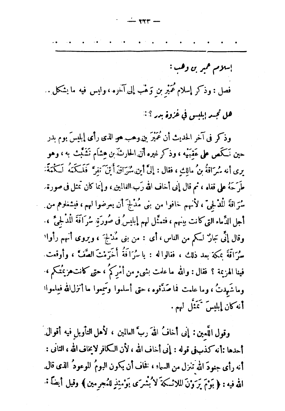 فَصْلٌ: وَذَكَرَ إسْلَامَ عُمَيْرِ بْنِ وَهْبٍ إلَى آخِرِهِ، وَلَيْسَ فِيهِ ما يشكل هل تجد إبْلِيسُ فِي غَزْوَةِ بَدْرٍ؟: