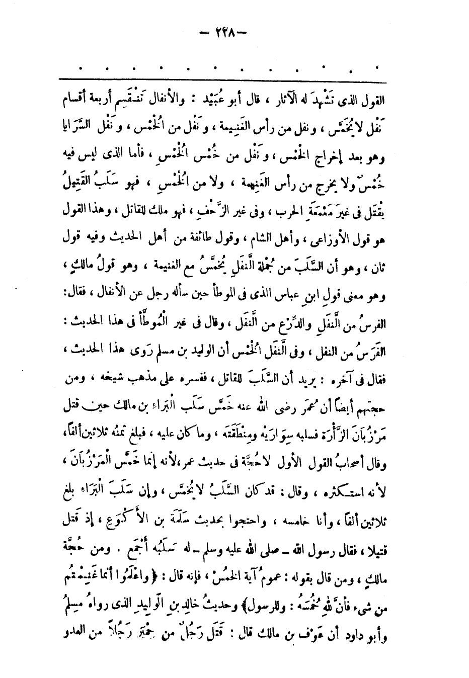 الْقَوْلُ الّذِي تَشْهَدُ لَهُ الْآثَارُ، قَالَ أَبُو عُبَيْدٍ: وَالْأَنْفَالُ تَنْقَسِمُ أَرْبَعَةَ أَقْسَامٍ نَفَلٌ لَا يُخَمّسُ، وَنَفَلٌ مِنْ رَأْسِ الْغَنِيمَةِ، وَنَفَلٌ مِنْ الْخُمُسِ، وَنَفَلُ السّرَايَا وَهُوَ بَعْدَ إخْرَاجِ الْخُمُسِ، وَنَفَلٌ مِنْ خُمُسِ الْخُمُسِ، فَأَمّا الّذِي لَيْسَ فِيهِ خُمُسٌ وَلَا يَخْرُجُ مِنْ رَأْسِ الْغَنِيمَةِ، وَلَا مِنْ الْخُمُسِ، فَهُوَ سَلَبُ الْقَتِيلِ يُقْتَلُ فِي غَيْرِ مَعْمَعَةِ الْحَرْبِ، وَفِي غَيْرِ الزّحْفِ، فَهُوَ مِلْكٌ لِلْقَاتِلِ، وَهَذَا الْقَوْلُ هُوَ قَوْلُ الْأَوْزَاعِيّ، وَأَهْلِ الشّامِ، وَقَوْلُ طَائِفَةٍ مِنْ أَهْلِ الْحَدِيثِ وَفِيهِ قَوْلٌ ثَانٍ، وَهُوَ أَنّ السّلَبَ مِنْ جُمْلَةِ النّفَلِ يُخَمّسُ مَعَ الْغَنِيمَةِ، وَهُوَ قَوْلُ مَالِكٍ، وَهُوَ مَعْنَى قَوْلِ ابْنِ عَبّاسٍ الّذِي فِي الْمُوَطّأِ حِينَ سَأَلَهُ رَجُلٌ عَنْ الْأَنْفَالِ، فَقَالَ: