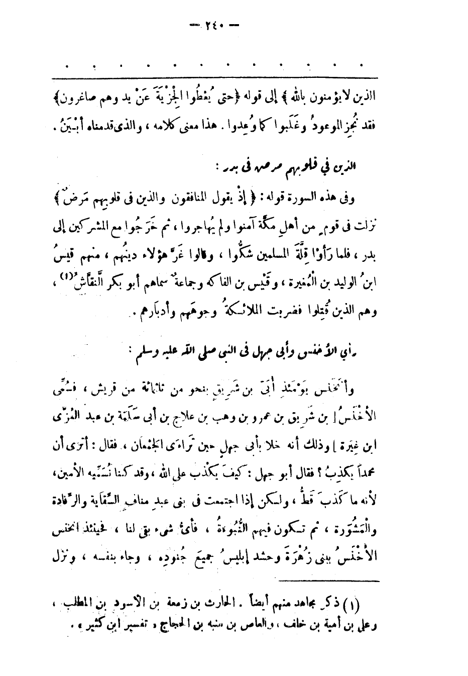 رَأْيُ الْأَخْنَسِ وَأَبِي جَهْلٍ فِي النّبِيّ صَلَّى اللَّهُ عَلَيْهِ وَسَلَّمَ: وَانْخَنَسَ يَوْمَئِذٍ أُبَيّ بْنِ شَرِيقٍ بِنَحْوِ مِنْ ثَلَثِمِائَةٍ مِنْ قُرَيْشٍ، فَسُمّيَ الْأَخْنَسُ بْنُ شَرِيقِ بْنِ عَمْرِو بْنِ وَهْبِ بْنِ عِلَاجِ بْنِ أبى سلمة بن عبد العزّى ابن غِيرَةَ وَذَلِكَ أَنّهُ خَلَا بِأَبِي جَهْلٍ حِينَ تَرَاءَى الْجَمْعَانِ، فَقَالَ: أَتَرَى أَنّ مُحَمّدًا يَكْذِبُ؟ فَقَالَ أَبُو جَهْلٍ: كَيْفَ يَكْذِبُ عَلَى اللهِ، وَقَدْ كُنّا نُسَمّيهِ الْأَمِينَ، لِأَنّهُ مَا كَذَبَ قَطّ، وَلَكِنْ إذَا اجْتَمَعَتْ فِي بَنِي عَبْدِ مَنَافٍ السّقَايَةَ وَالرّفَادَةَ وَالْمَشُورَةَ، ثُمّ تَكُونُ فِيهِمْ النّبوة، فَأَيّ شَيْءٍ بَقِيَ لَنَا، فَحِينَئِذٍ انْخَنَسَ الْأَخْنَسُ بِبَنِي زُهْرَةَ وَحَشَدَ إبْلِيسُ جَمِيعَ جُنُودِهِ، وَجَاءَ بنفسه، ونزل