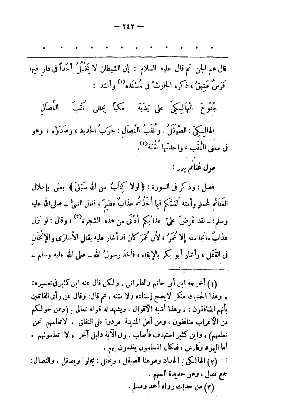 حَوْلَ غَنَائِمِ بَدْر: فَصْلٌ: وَذَكَرَ فِي السّورَةِ: لَوْلا كِتابٌ مِنَ اللَّهِ سَبَقَ يَعْنِي بِإِحْلَالِ الْغَنَائِمِ لِمُحَمّدِ وَأُمّتِهِ لَمَسّكُمْ فِيمَا أَخَذْتُمْ عَذَابٌ عَظِيمٌ، فَقَالَ النّبِيّ- صَلَّى اللَّهُ عَلَيْهِ وَسَلَّمَ: - لَقَدْ عُرِضَ عَلَيّ عَذَابُكُمْ أَدْنَى مِنْ هَذِهِ الشّجَرَةِ «3» ، وَقَالَ: لَوْ نَزَلَ عَذَابٌ مَا نَجَا مِنْهُ إلّا عُمَرُ، لِأَنّ عُمَرَ كان قد أشار عليه بقتل الأسارى والإنخان فِي الْقَتْلِ، وَأَشَارَ أَبُو بَكْرٍ بِالْإِبْقَاءِ، فَأَخَذَ رَسُولُ اللهِ- صَلّى اللهُ عَلَيْهِ وَسَلّمَ-