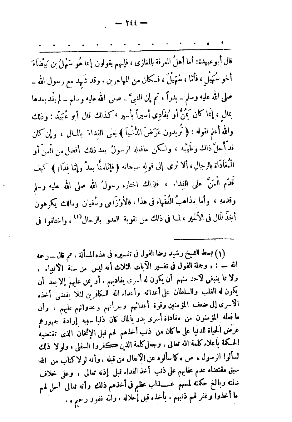 قَالَ أَبُو عُبَيْدَةَ: أَمّا أَهْلُ الْمَعْرِفَةِ بِالْمَغَازِي، فإنهم يقولون إنما هو سهل بن بَيْضَاءَ أَخُو سُهَيْلٍ، فَأَمّا، سُهَيْلٌ، فَكَانَ مِنْ الْمُهَاجِرِينَ، وَقَدْ شَهِدَ مَعَ رَسُولِ اللهِ- صَلَّى اللَّهُ عَلَيْهِ وَسَلَّمَ- بَدْرًا، ثُمّ إنّ النّبِيّ- صَلَّى اللَّهُ عَلَيْهِ وَسَلَّمَ- لَمْ يَفْدِ بَعْدَهَا بِمَالِ، إنّمَا كَانَ يَمُنّ أَوْ يُفَادِي أَسِيرًا بِأَسِيرِ، كَذَلِكَ قَالَ أَبُو عُبَيْدٍ: وَذَلِكَ وَاَللهُ أعلم لقوله: تُرِيدُونَ عَرَضَ الدُّنْيا يَعْنِي الْفِدَاءَ بِالْمَالِ، وَإِنْ كَانَ قَدْ أَحَلّ ذَلِكَ وَطَيّبَهُ، وَلَكِنْ مَا فَعَلَهُ الرّسُولُ بَعْدَ ذَلِكَ أَفْضَلُ مِنْ الْمَنّ أَوْ الْمُفَادَاةِ بِالرّجَالِ، أَلَا تَرَى إلَى قَوْلِهِ سُبْحَانَهُ فَإِمَّا مَنًّا بَعْدُ وَإِمَّا فِداءً كَيْفَ قَدّمَ الْمَنّ عَلَى الْفِدَاءِ، فَلِذَلِكَ اخْتَارَهُ رَسُولُ اللهِ صَلَّى اللَّهُ عَلَيْهِ وَسَلَّمَ وَقَدّمَهُ، وَأَمّا مَذَاهِبُ الْفُقَهَاءِ فِي هَذَا، فَالْأَوْزَاعِيّ وَسُفْيَانُ وَمَالِكٌ يَكْرَهُونَ أَخْذَ الْمَالِ فِي الْأَسِيرِ، لِمَا فِي ذَلِكَ مِنْ تَقْوِيَةِ الْعَدُوّ بِالرّجَالِ «1» ، وَاخْتَلَفُوا فى