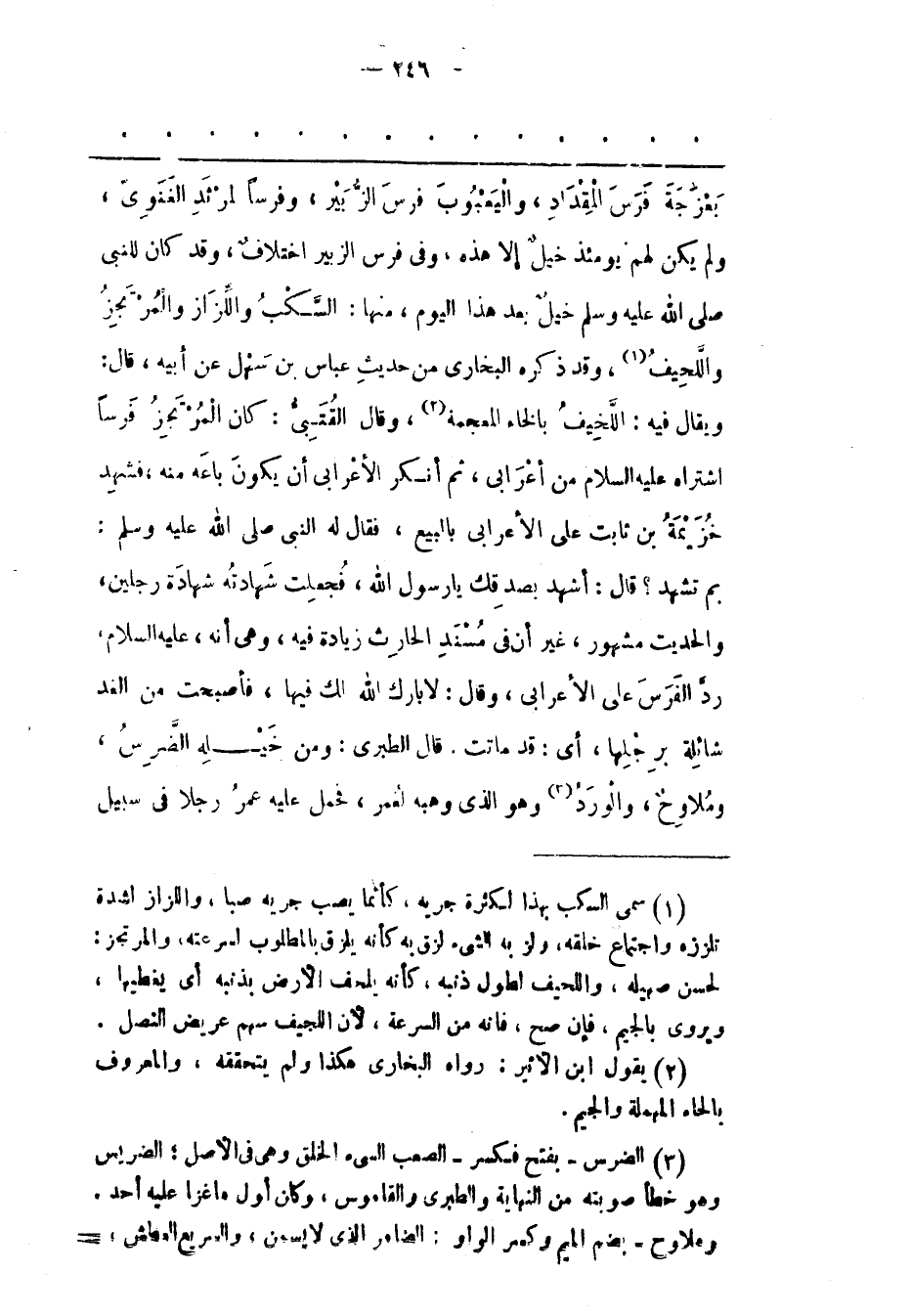 بِمَ تَشْهَدُ؟ قَالَ: أَشْهَدُ بِصِدْقِك يَا رَسُولَ اللهِ، فَجُعِلَتْ شَهَادَتُهُ شَهَادَةَ رَجُلَيْنِ، وَالْحَدِيثُ مَشْهُورٌ، غَيْرَ أَنّ فِي مُسْنَدِ الْحَارِثِ زِيَادَةً فِيهِ، وَهِيَ أَنّهُ، عَلَيْهِ السّلَامُ، رَدّ الْفَرَسَ عَلَى الْأَعْرَابِيّ، وَقَالَ: لَا بَارَكَ اللهُ لَك فِيهَا، فَأَصْبَحَتْ مِنْ الْغَدِ شَائِلَةً بِرِجْلِهَا، أَيْ: قَدْ مَاتَتْ. قَالَ الطّبَرِيّ: وَمِنْ خَيْلِهِ الضّرِسُ، وَمُلَاوِحٌ، وَالْوَرَدُ «3» وَهُوَ الّذِي وَهَبَهُ لِعُمَرِ، فحمل عليه عمر رجلا فى سبيل