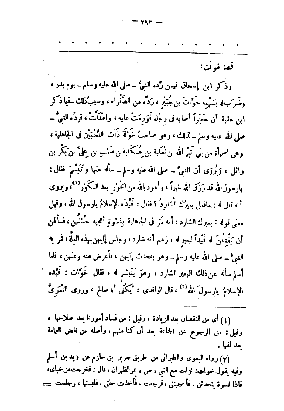 قصة غوات: وَذَكَرَ ابْنُ إسْحَاقَ فِيمَنْ رَدّهُ النّبِيّ- صَلَّى اللَّهُ عَلَيْهِ وَسَلَّمَ- يَوْمَ بَدْرٍ، وَضَرَبَ لَهُ بِسَهْمِهِ خَوّاتَ بْنَ جُبَيْرٍ، رَدّهُ مِنْ الصّفْرَاءِ، وَسَبَبُ ذَلِكَ- فِيمَا ذَكَرَ ابْنُ عُقْبَةَ أَنّ حَجَرًا أَصَابَهُ فِي رِجْلِهِ فَوَرِمَتْ عَلَيْهِ، وَاعْتَلّتْ، فَرَدّهُ النّبِيّ- صَلَّى اللَّهُ عَلَيْهِ وَسَلَّمَ- لِذَلِكَ، وَهُوَ صَاحِبُ خَوْلَةَ ذَاتِ النّحْيَيْنِ فِي الْجَاهِلِيّةِ، وَهِيَ امْرَأَةٌ مِنْ بَنِي تَيْمِ اللهِ بْنِ ثَعْلَبَةَ بْنِ عُكَابَةَ بْنِ صَعْبِ بْنِ عَلِيّ بْنِ بَكْرِ بْنِ وَائِلٍ، وَيُرْوَى أَنّ النّبِيّ- صَلَّى اللَّهُ عَلَيْهِ وَسَلَّمَ- سَأَلَهُ عَنْهَا وَتَبَسّمَ فَقَالَ:
