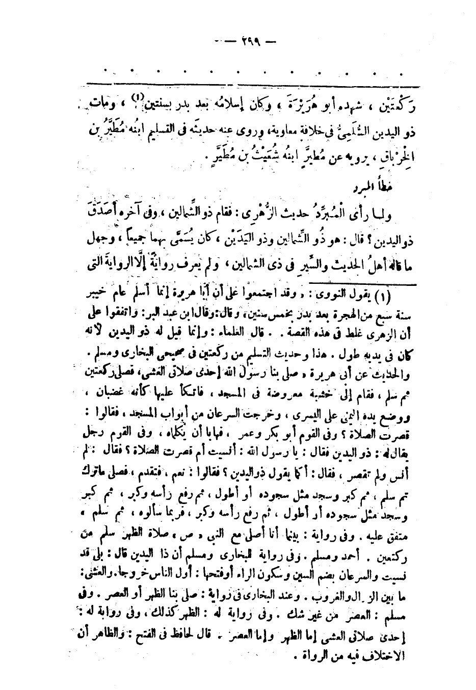 (1) يقول النووى: «وقد اجتمعوا على أن أبا هريرة إنما أسلم عام خيبر سنة سبع من الهجرة بعد بدر بخمس سنين، وقال: وقال ابن عبد البر: واتفقوا على أن الزهرى غلط فى هذه القصة. قال العلماء: وإنما قيل له ذو اليدين لأنه كان فى يديه طول. هذا وحديث التسليم من ركعتين فى صحيحى البخارى ومسلم. والحديث عن أبى هريرة «صلى بنا رسول الله إحدى صلاتى العشى، فصلى ركعتين ثم سلم، فقام إلى خشبة معروضة فى المسجد، فاتكأ عليها كأنه غضبان، ووضع يده اليمن على اليسرى، وخرجت السرعان من أبواب المسجد، فقالوا: قصرت الصلاة؟ وفى القوم أبو بكر وعمر، فهابا أن يكلماه، وفى القوم رجل يقال له: ذو اليدين فقال: يا رسول الله: ألسيت أم قصرت الصلاة؟ فقال: لم أنس ولم تقصر، فقال: أكما يقول ذو اليدين؟ فقالوا: نعم، فتقدم، فصلى ما ترك ثم سلم، ثم كبر وسجد مثل سجوده أو أطول، ثم رفع رأسه وكبر، ثم كبر وسجد مثل سجوده أو أطول، ثم رفع رأسه وكبر، فربما سألوه، ثم سلم» متفق عليه. وفى رواية: بينما أنا أصلى مع النبى «ص» صلاة الظهر سلم من ركعتين. أحمد ومسلم. وفى رواية للبخارى ومسلم أن ذا اليدين قال: بلى قد نسيت والسرعان بضم السين وسكون الراء أو فتحها: أول الناس خروجا. والعشى: ما بين الزال والغروب. وعند البخارى فى رواية: صلى بنا الظهر أو العصر. وفى مسلم: العصر من غير شك. وفى رواية له: الظهر كذلك، وفى رواية له: إحدى صلاتى العشى إما الظهر وإما العصر. قال لحافظ فى الفتح: والظاهر أن الاختلاف فيه من الرواة.