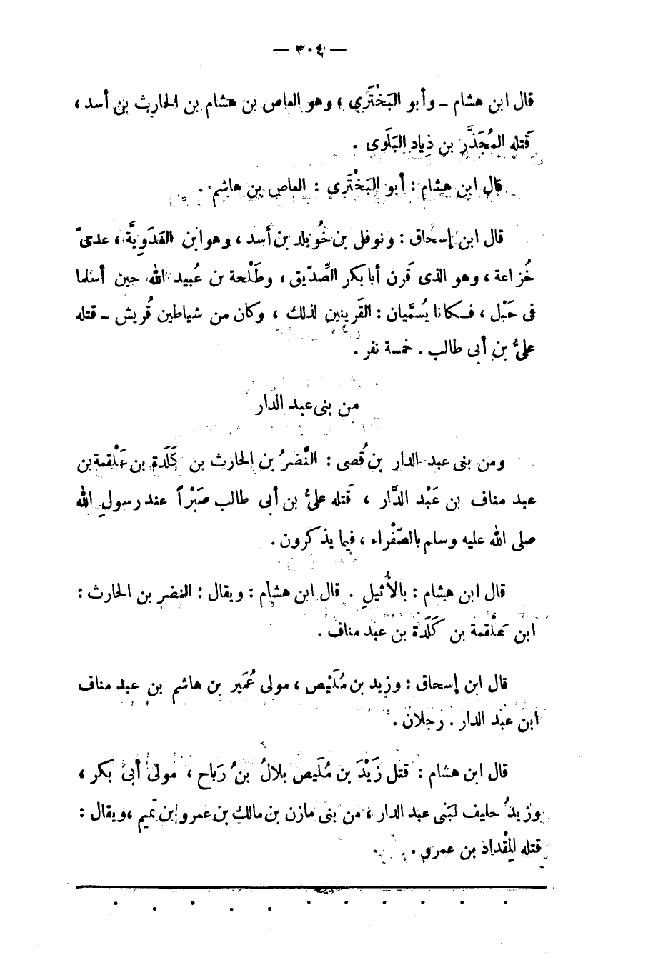 قَالَ ابْنُ هِشَامٍ: أَبُو الْبَخْتَرِيّ: الْعَاصِ بْنُ هَاشِمٍ قَالَ ابْنُ إسْحَاقَ: وَنَوْفَلُ بْنُ خُوَيْلِدِ بْنِ أَسَدٍ، وَهُوَ ابْنُ الْعَدَوِيّةِ، عَدِيّ خُزَاعَةَ، وَهُوَ الّذِي قَرَنَ أَبَا بَكْرٍ الصّدّيق، وَطَلْحَةَ بْنَ عُبَيْدِ اللهِ حِينَ أَسْلَمَا فِي حَبْلٍ، فَكَانَا يُسَمّيَانِ: الْقَرِينَيْنِ لِذَلِكَ، وَكَانَ مِنْ شَيَاطِينِ قُرَيْشٍ- قَتَلَهُ عَلِيّ بن أبى طالب. خمسة نفر.