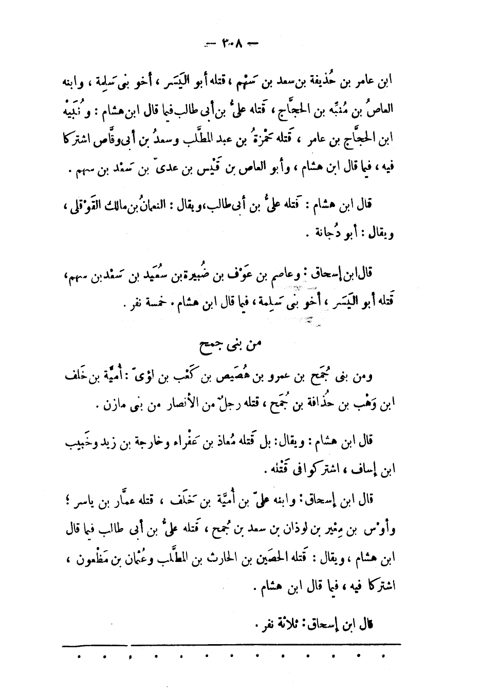 ابن عامر بن حذيفة بن سعد بن سهم، قتله أبو اليسر، أخو بنى سلمة، وَابْنُهُ الْعَاصِ بْنُ مُنَبّهِ بْنِ الْحَجّاجِ، قَتَلَهُ عَلِيّ بْنُ أَبِي طَالِبٍ فِيمَا قَالَ ابْنُ هشام: ونبيه ابن الْحَجّاجِ بْنِ عَامِرٍ، قَتَلَهُ حَمْزَةُ بْنُ عَبْدِ الْمُطّلِبِ وَسَعْدُ بْنُ أَبِي وَقّاصٍ اشْتَرَكَا فِيهِ، فِيمَا قَالَ ابْنُ هِشَامٍ، وَأَبُو الْعَاصِ بْنُ قيس بن عدي بن سعد بن سهم.