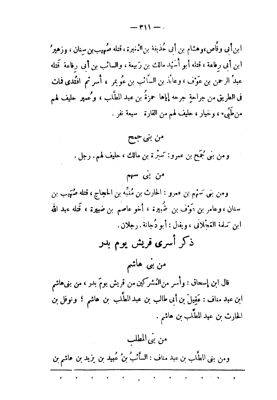 من بنى هاشم قَالَ ابْنُ إسْحَاقَ: وَأُسِرَ مِنْ الْمُشْرِكِينَ مِنْ قريش يوم بدر، من بنى هاشم ابن عَبْدِ مَنَافٍ: عَقِيلُ بْنُ أَبِي طَالِبِ بْنِ عَبْدِ الْمُطّلِبِ بْنِ هَاشِمٍ؛ وَنَوْفَلُ بْنُ الْحَارِثِ بن عبد المطّلب بن هاشم.