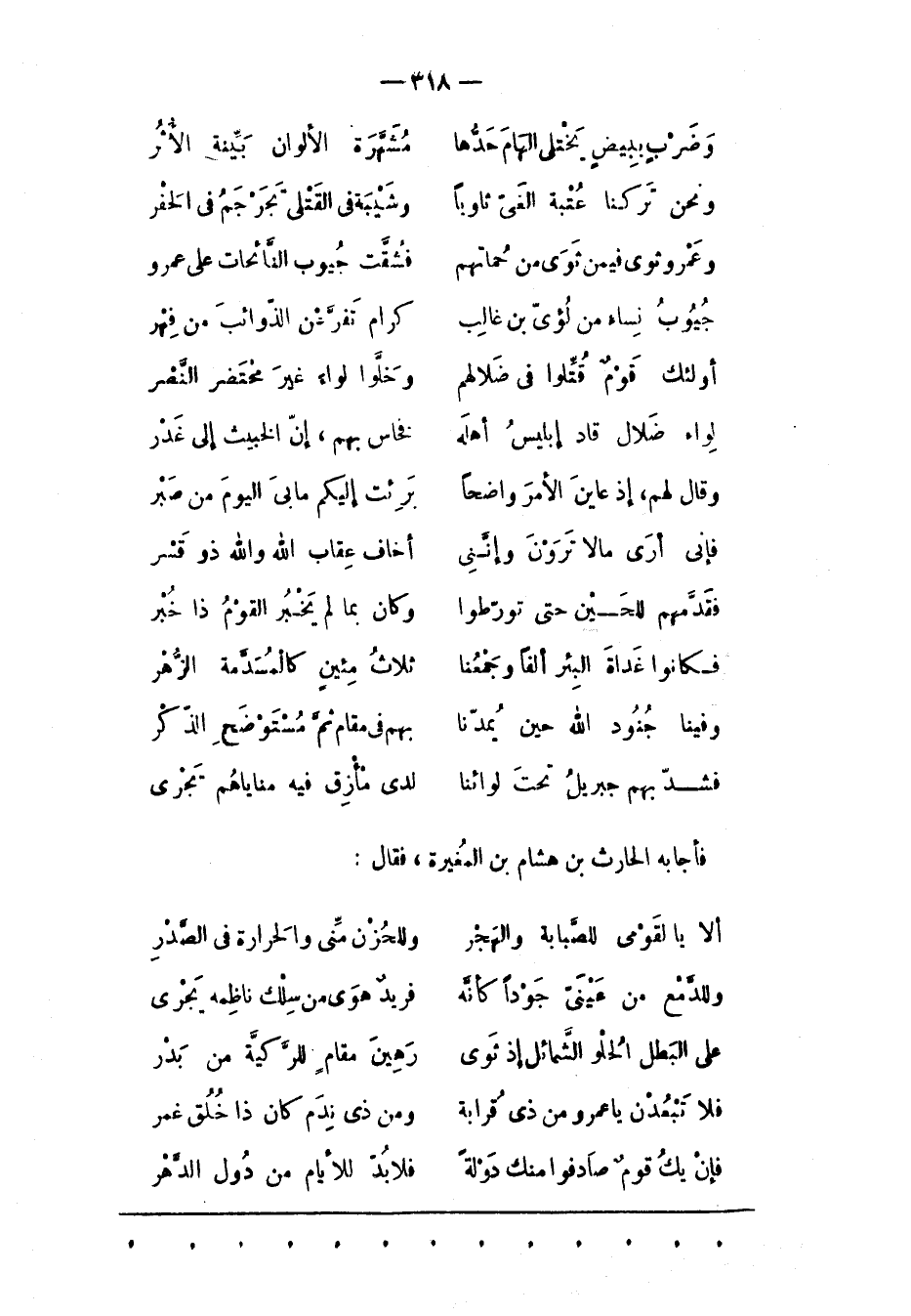 فَأَجَابَهُ الْحَارِثُ بْنُ هِشَامِ بْنِ الْمُغِيرَةِ، فَقَالَ: