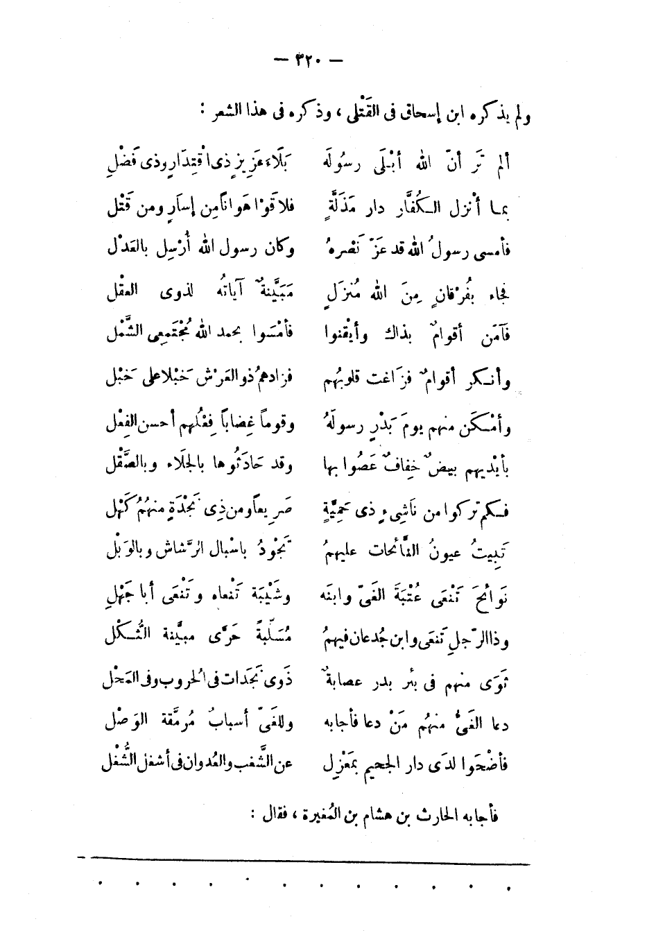 ثَوَى مِنْهُمْ فِي بِئْرِ بَدْرٍ عِصَابَةٌ ... ذَوِي نَجَدَاتٍ فِي الْحُرُوبِ وَفِي الْمَحْل