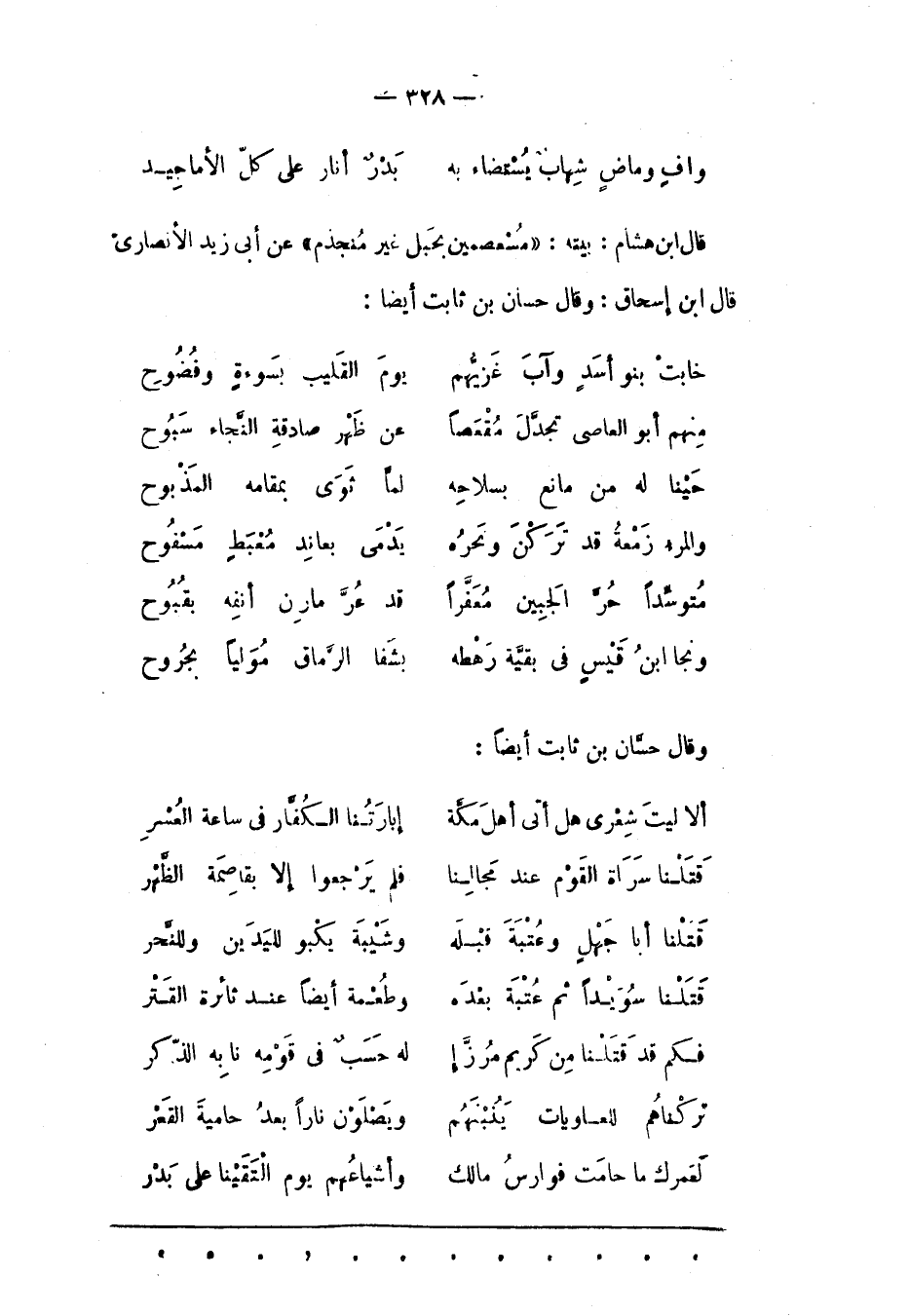 قَالَ ابْنُ هِشَامٍ: بَيْتُهُ: «مسعصمين بِحَبْلٍ غَيْرِ مُنْجَذِمٍ» عَنْ أَبِي زَيْدٍ الْأَنْصَارِيّ قَالَ ابْنُ إسْحَاقَ: وَقَالَ حَسّانُ بْنُ ثَابِتٍ أيضا: