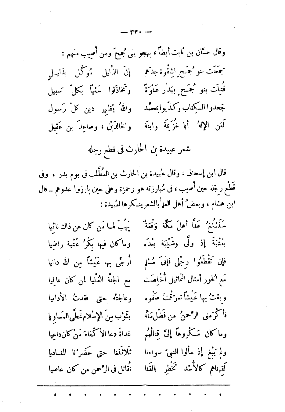 شِعْرُ عَبِيدَةَ بْنِ الْحَارِثِ فِي قَطْعِ رِجْلِهِ قَالَ ابْنُ إسْحَاقَ: وَقَالَ عُبَيْدَةُ بْنُ الْحَارِثِ بْنِ الْمُطّلِبِ فى يوم بدر، وفى قطع رجله حين أصيب، فِي مُبَارَزَتِهِ هُوَ وَحَمْزَةُ وَعَلِيّ حِينَ بَارَزُوا عَدُوّهُمْ- قَالَ ابْنُ هِشَامٍ، وَبَعْضُ أَهْلِ الْعِلْمِ بالشعر ينكرها لعبيدة: