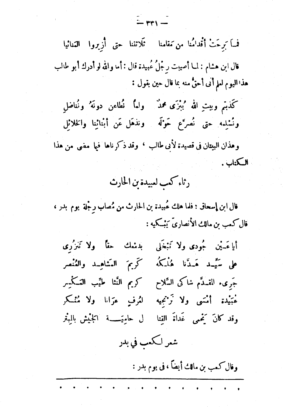 رِثَاءُ كَعْبٍ لِعَبِيدَةَ بْنِ الْحَارِثِ قَالَ ابْنُ إسْحَاقَ: فَلَمّا هَلَكَ عَبِيدَة بْنُ الْحَارِثِ مِنْ مُصَابِ رِجْلِهِ يَوْمَ بَدْرٍ، قَالَ كَعْبُ بْنُ مالك الأنصارىّ يبكيه: