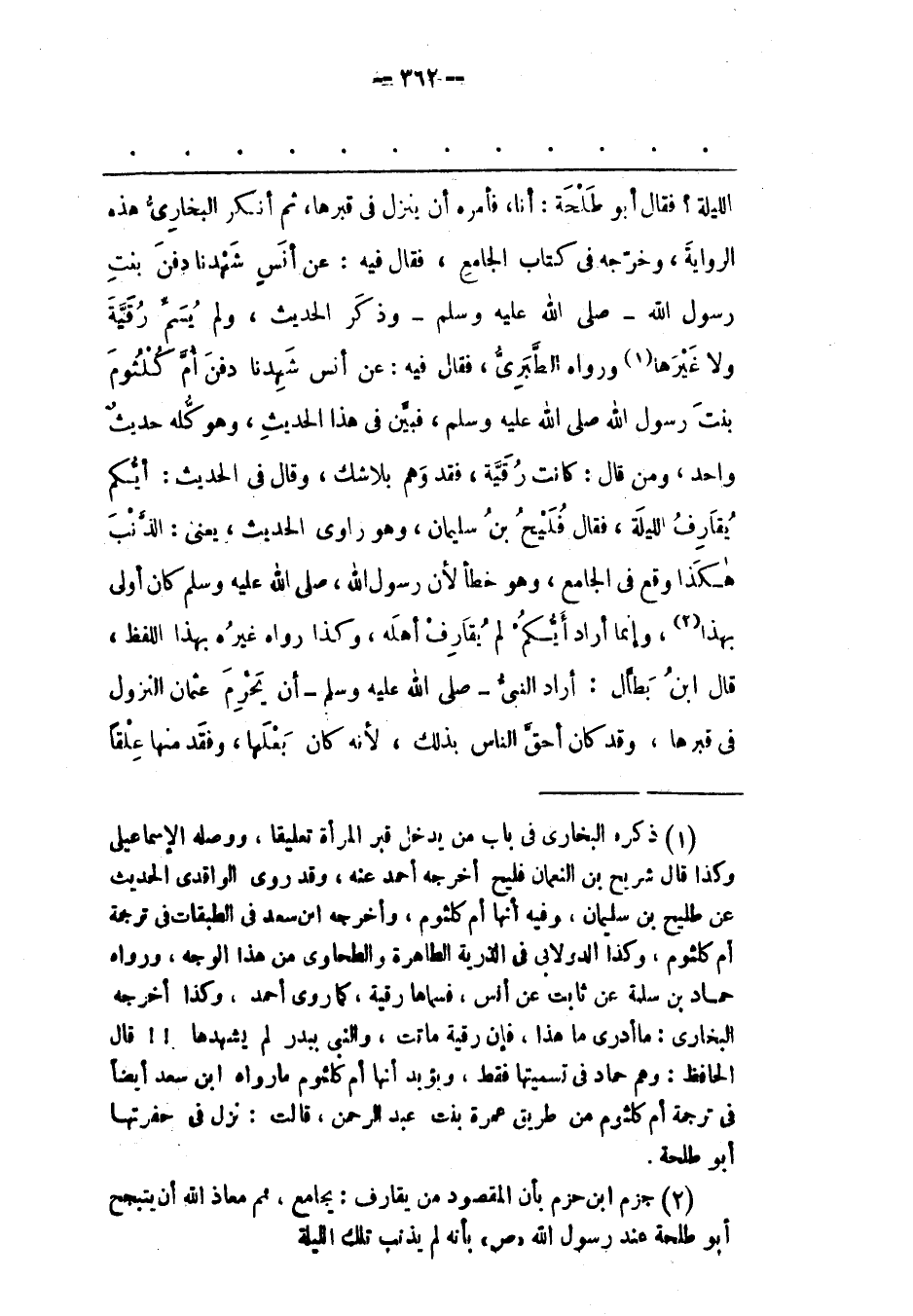 (1) ذكره البخارى فى باب من يدخل قبر المرأة تعليقا، ووصله الإسماعيلى وكذا قال شريح بن النعمان فليح أخرجه أحمد عنه، وقد روى الواقدى الحديث عن طليح بن سليمان، وفيه أنها أم كلثوم، وأخرجه ابن سعد فى الطبقات فى ترجمة أم كلثوم، وكذا الدولابى فى الذرية الطاهرة والطحاوى من هذا الوجه، ورواه حماد بن سلمة عن ثابت عن أنس، فسماها رقية، كما روى أحمد، وكذا أخرجه البخارى: ما أدرى ما هذا، فإن رقية ماتت، والنبى ببدر لم يشهدها!! قال الحافظ: وهم حماد فى تسميتها فقط، ويؤيد أنها أم كلثوم ما رواه ابن سعد أيضا فى ترجمة أم كلثوم من طريق عمرة بنت عبد الرحمن، قالت: نزل فى حفرتها أبو طلحة.