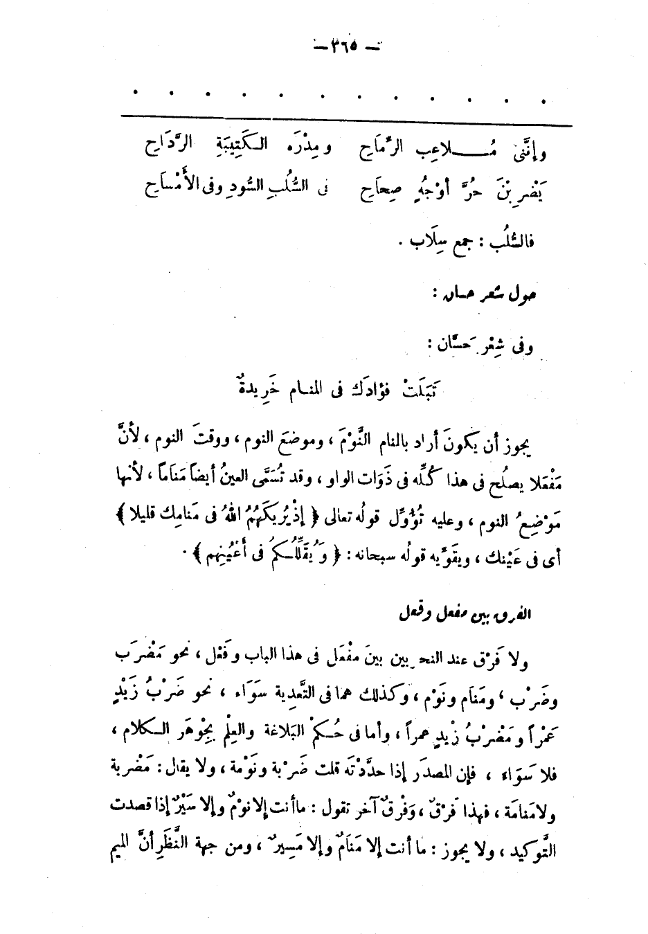 الْفَرْقُ بَيْنَ مَفْعَلٍ وَفَعْلٍ وَلَا فَرْقَ عِنْدَ النحريين بَيْنَ مَفْعَلٍ فِي هَذَا الْبَابِ وَفَعْلٍ، نَحْوَ مَضْرَبٍ وَضَرْبٍ، وَمَنَامٍ وَنَوْمٍ، وَكَذَلِكَ هُمَا فِي التّعْدِيَةِ سَوَاءٌ، نَحْوَ ضَرَبَ زَيْدٌ عَمْرًا وَمَضْرَبُ زَيْدٌ عَمْرًا، وَأَمّا فِي حُكْمِ الْبَلَاغَةِ وَالْعِلْمِ بِجَوْهَرِ الْكَلَامِ، فَلَا سَوَاءَ، فَإِنّ الْمَصْدَرَ إذَا حَدّدْته قُلْت ضَرْبَةً وَنَوْمَةً، وَلَا يُقَالُ: مَضْرَبَةً وَلَا مَنَامَةً، فَهَذَا فَرْقٌ، وَفَرْقٌ آخَرُ تَقُولُ: مَا أَنْتَ إلّا نَوْمٌ وَإِلّا سَيْرٌ إذَا قَصَدْت التّوْكِيدَ، وَلَا يَجُوزُ: مَا أَنْتَ إلّا مَنَامٌ وَإِلّا مَسِيرٌ، وَمِنْ جِهَةِ النّظَرِ أَنّ الميم