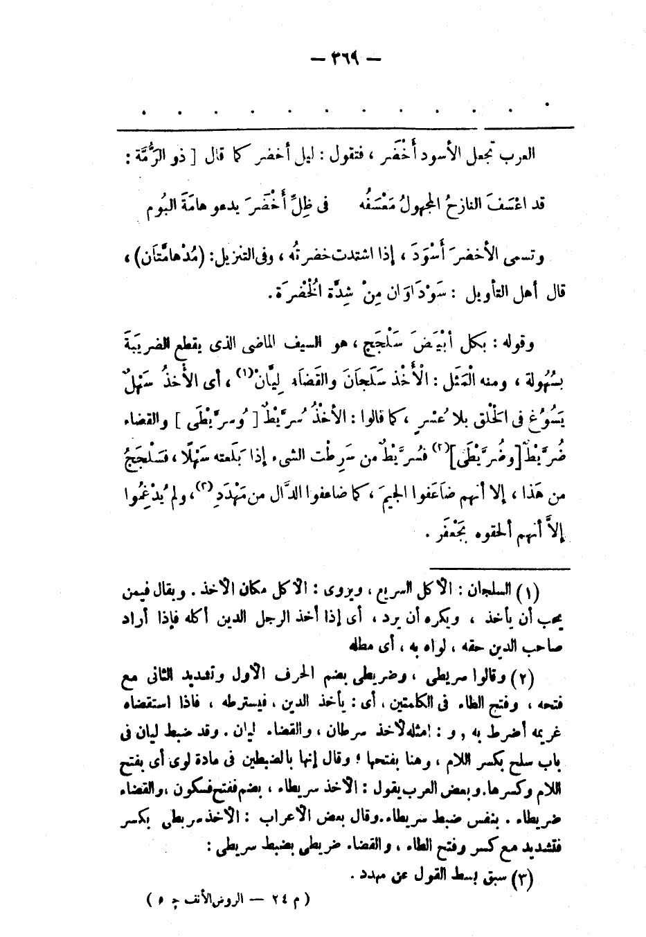 وَقَوْلُهُ: بِكُلّ أَبْيَضَ سَلْجَجِ، هو السيف الماضى الذى يقطع الضريبة بسهولة، ومنه الْمَثَلُ: الْأَخْذُ سَلَجَانَ وَالْقَضَاءُ لِيّانْ «1» ، أَيْ الْأَخْذُ سَهْلٌ يَسُوغُ فِي الْحَلْقِ بِلَا عُسْرٍ، كَمَا قَالُوا: الْأَخْذُ سُرّيْطٌ [وَسُرّيْطَى] وَالْقَضَاءُ ضُرّيْطٌ [وَضُرّيْطَى] «2» فَسُرّيْطٌ مِنْ سَرِطْت الشّيْءَ إذَا بَلَعْته سَهْلًا، فَسَلْجَجُ مِنْ هَذَا، إلّا أَنّهُمْ ضَاعَفُوا الْجِيمَ، كَمَا ضَاعَفُوا الدّالَ مِنْ مَهْدَدِ «3» ، وَلَمْ يُدْغِمُوا إلّا أنهم ألحقوه بجعفر.