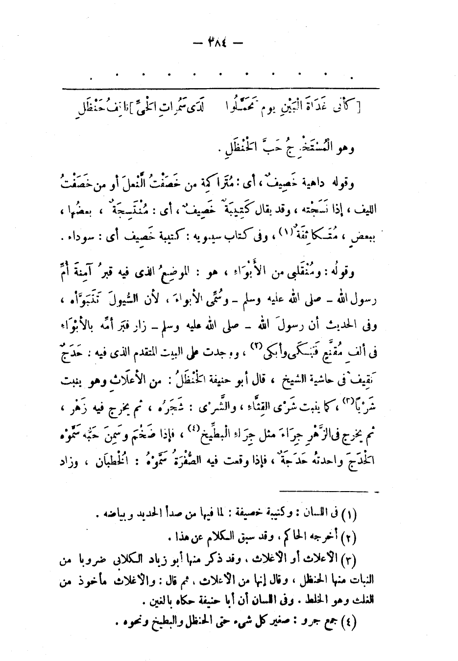 وَقَوْلُهُ: وَمُنْقَلَبِي مِنْ الْأَبْوَاءِ، هُوَ: الْمَوْضِعُ الّذِي فِيهِ قَبْرُ آمِنَةَ أُمّ رَسُولِ اللهِ- صَلَّى اللَّهُ عَلَيْهِ وَسَلَّمَ- وَسُمّيَ الْأَبْوَاءَ، لِأَنّ السّيُولَ تَتَبَوّأهُ، وَفِي الْحَدِيثِ أَنّ رَسُولَ اللهِ- صَلَّى اللَّهُ عَلَيْهِ وَسَلَّمَ- زَارَ قَبْرَ أمه بالأبواء في ألف مقنع فبكى وأبكى «2» ، وَوَجَدْت عَلَى الْبَيْتِ الْمُتَقَدّمِ الّذِي فِيهِ: حَدَجٌ نَقِيفُ فِي حَاشِيَةِ الشّيْخِ، قَالَ أَبُو حَنِيفَةَ الْحَنْظَلُ: مِنْ الْأَعْلَاثِ وَهُوَ يَنْبُتُ شَرْيًا «3» ، كَمَا يَنْبُت شَرِيّ الْقِثّاءِ، وَالشّرِيّ: شَجَرُهُ، ثُمّ يَخْرُجُ فِيهِ زَهْرٌ، ثُمّ يَخْرُجُ فِي الزّهْرُ جِرَاءَ مِثْلَ جِرَاءِ الْبِطّيخِ «4» ، فَإِذَا ضَخُمَ وَسَمِنَ حَبّهُ سَمّوْهُ الْحَدَجَ وَاحِدَتُهُ حَدَجَةٌ، فَإِذَا وَقَعَتْ فِيهِ الصّفرة سمّوه: الخطبان، وزاد