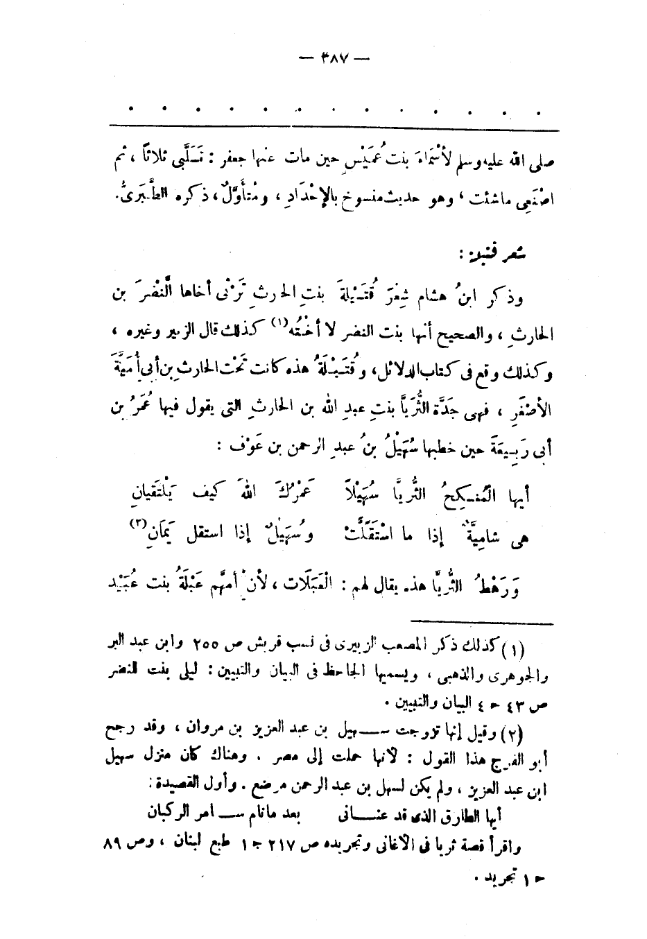 وَذَكَرَ ابْنُ هشام شعر قتيلة بنت الحرث تَرِثِي أَخَاهَا النّضْرَ بْنَ الْحَارِثِ، وَالصّحِيحُ أَنّهَا بِنْتُ النّضْرِ لَا أُخْتُهُ «1» كَذَلِكَ قَالَ الزّبَيْرُ وغيره، وكذلك وقع فى كتاب الدلائل، وقتبلة هَذِهِ كَانَتْ تَحْتَ الْحَارِثِ بْنِ أَبِي أُمَيّةَ الْأَصْغَرِ، فَهِيَ جَدّةُ الثّرَيّا بِنْتِ عَبْدِ اللهِ بْنِ الْحَارِثِ الّتِي يَقُولُ فِيهَا عُمَرُ بْنُ أَبِي رَبِيعَةَ حِينَ خَطَبَهَا سُهَيْلُ بْنُ عَبْدِ الرّحْمَنِ بْنِ عَوْفٍ: