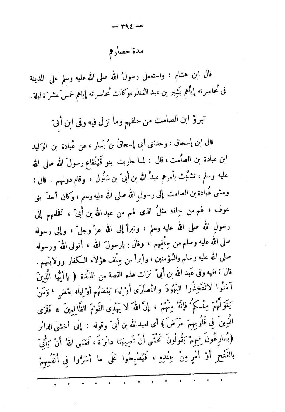 قَالَ: فَفِيهِ وَفِي عَبْدِ اللهِ بْنِ أُبَيّ نَزَلَتْ هَذِهِ الْقِصّةُ مِنْ الْمَائِدَةِ يَا أَيُّهَا الَّذِينَ آمَنُوا لَا تَتَّخِذُوا الْيَهُودَ وَالنَّصارى أَوْلِياءَ بَعْضُهُمْ أَوْلِياءُ بَعْضٍ، وَمَنْ يَتَوَلَّهُمْ مِنْكُمْ فَإِنَّهُ مِنْهُمْ، إِنَّ اللَّهَ لَا يَهْدِي الْقَوْمَ الظَّالِمِينَ* فَتَرَى الَّذِينَ فِي قُلُوبِهِمْ مَرَضٌ أَيْ لِعَبْدِ اللهِ بن أبىّ وقوله: إنى أخشى الدائر يُسارِعُونَ فِيهِمْ يَقُولُونَ نَخْشى أَنْ تُصِيبَنا دائِرَةٌ، فَعَسَى اللَّهُ أَنْ يَأْتِيَ بِالْفَتْحِ أَوْ أَمْرٍ مِنْ عِنْدِهِ، فَيُصْبِحُوا عَلى مَا أَسَرُّوا فِي أَنْفُسِهِمْ