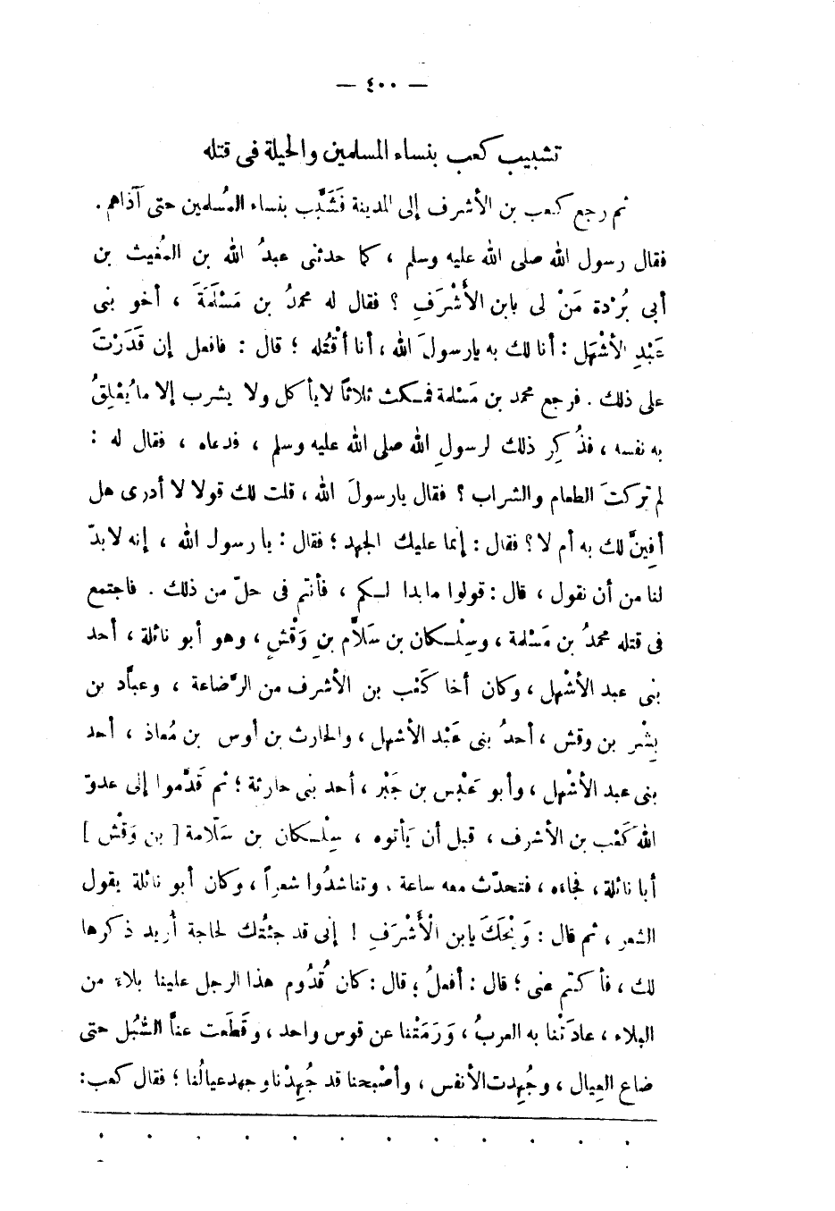 فَقَالَ رَسُولُ اللهِ صَلَّى اللَّهُ عَلَيْهِ وَسَلَّمَ، كَمَا حَدّثَنِي عَبْدُ اللهِ بْنُ الْمُغِيثِ بْنِ أَبِي بُرْدَةَ مَنْ لِي بِابْنِ الْأَشْرَفِ؟ فَقَالَ لَهُ مُحَمّدُ بن مسلمة، أخو بنى عبد لأشهل: أَنَا لَك بِهِ يَا رَسُولَ اللهِ، أَنَا أَقْتُلُهُ؛ قَالَ: فَافْعَلْ إنْ قَدَرْتَ عَلَى ذَلِكَ. فَرَجَعَ مُحَمّدُ بْنُ مَسْلَمَةَ فَمَكَثَ ثَلَاثًا لَا يَأْكُلُ وَلَا يَشْرَبُ إلّا مَا يُعْلِقُ بِهِ نَفْسَهُ، فَذُكِرَ ذَلِكَ لِرَسُولِ اللهِ صَلَّى اللَّهُ عَلَيْهِ وَسَلَّمَ، فَدَعَاهُ، فَقَالَ لَهُ:
