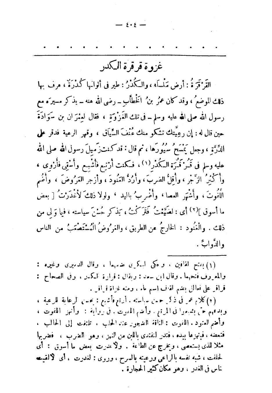 غَزْوَةُ قَرْقَرَةِ الْكُدْرِ الْقَرْقَرَةُ: أَرْضٌ مَلْسَاءُ، وَالْكُدْرُ: طَيْرٌ فِي أَلْوَانِهَا كُدْرَةٌ، عُرِفَ بِهَا ذَلِكَ الْمَوْضِعُ، وَقَدْ كَانَ عُمَرُ بْنُ الْخَطّابِ- رَضِيَ اللهُ عَنْهُ- يَذْكُرُ مَسِيرَهُ مَعَ رَسُولِ اللهِ صَلَّى اللَّهُ عَلَيْهِ وَسَلَّمَ- فِي تِلْكَ الْغَزْوَةِ، فَقَالَ لِعِمْرَانَ بْنِ سَوَادَةَ حِينَ قَالَ لَهُ: إنّ رَعِيّتَك تَشْكُو مِنْك عُنْفَ السّيَاقِ، وَقَهْرَ الرّعِيّةِ فَدَقَر عَلَى الدّرّةِ، وَجَعَلَ يَمْسَحُ سُيُورَهَا، ثُمّ قَالَ: قَدْ كُنْت زَمِيل رَسُولِ اللهِ صَلَّى اللَّهُ عَلَيْهِ وَسَلَّمَ فِي قَرْقَرَةِ الْكُدْرِ «1» ، فَكُنْت أُرْتِعُ فَأُشْبِعُ وَأَسْقِي فَأَرْوِي، وَأُكْثِرُ الزّجْرَ، وَأُقِلّ الضّرْبَ، وَأَرُدّ الْعَنُودَ، وَأَزْجُرُ الْعَرُوضَ، وَاضَمّ اللّفُوتَ، وَأُشْهِرُ الْعَصَا، وَأَضْرِبُ بِالْيَدِ، وَلَوْلَا ذَلِكَ لأغدرت [بَعْضَ مَا أَسُوقُ] «2» أَيْ: لَضَيّعْت فَتَرَكْت، يَذْكُرُ حَسَنَ سِيَاسَتِهِ، فِيمَا وَلِي مِنْ ذَلِكَ. وَالْعَنُودُ: الْخَارِجُ عَنْ الطّرِيقِ، وَالْعَرُوضُ الْمُسْتَصْعَبُ مِنْ النّاسِ والدّوابّ.
