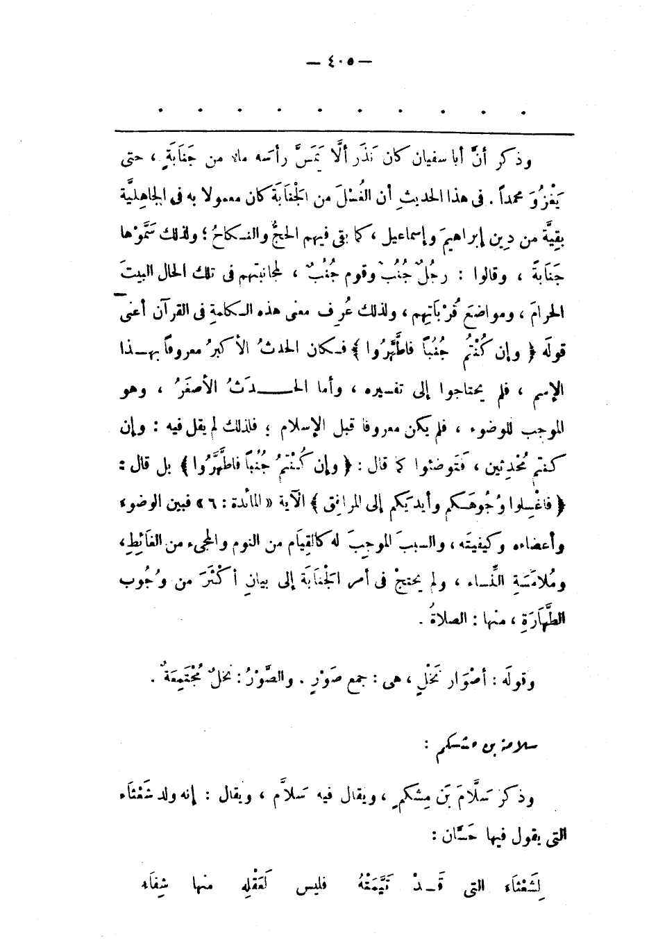 وَذَكَرَ أَنّ أَبَا سُفْيَانَ كَانَ نَذَرَ أَلّا يَمَسّ رَأْسَهُ مَاءٌ مِنْ جَنَابَةٍ، حَتّى يَغْزُوَ مُحَمّدًا. فِي هَذَا الْحَدِيثِ أَنّ الْغُسْلَ مِنْ الْجَنَابَةِ كَانَ مَعْمُولًا بِهِ فِي الْجَاهِلِيّةِ بَقِيّةً مِنْ دِينِ إبْرَاهِيمَ وَإِسْمَاعِيلَ، كَمَا بَقِيَ فِيهِمْ الْحَجّ وَالنّكَاحُ؛ وَلِذَلِكَ سَمّوْهَا جَنَابَةً، وَقَالُوا: رَجُلٌ جُنُبٌ وَقَوْمٌ جُنُبٌ، لِمُجَانَبَتِهِمْ فِي تِلْكَ الْحَالِ الْبَيْتَ الْحَرَامَ، وَمَوَاضِعَ قُرْبَاتِهِمْ، وَلِذَلِكَ عُرِفَ مَعْنَى هَذِهِ الْكَلِمَةِ فِي الْقُرْآنِ أَعْنِي قَوْلَهُ وَإِنْ كُنْتُمْ جُنُباً فَاطَّهَّرُوا فكان الحدث الأكبر مَعْرُوفًا بِهَذَا الِاسْمِ، فَلَمْ يَحْتَاجُوا إلَى تَفْسِيرِهِ، وَأَمّا الْحَدَثُ الْأَصْغَرُ، وَهُوَ الْمُوجِبُ لِلْوُضُوءِ، فَلَمْ يَكُنْ مَعْرُوفًا قَبْلَ الْإِسْلَامِ؛ فَلِذَلِكَ لَمْ يَقُلْ فِيهِ: وَإِنْ كُنْتُمْ مُحْدِثِينَ، فَتَوَضّئُوا كَمَا قَالَ: وَإِنْ كُنْتُمْ جُنُباً فَاطَّهَّرُوا بَلْ قَالَ:
