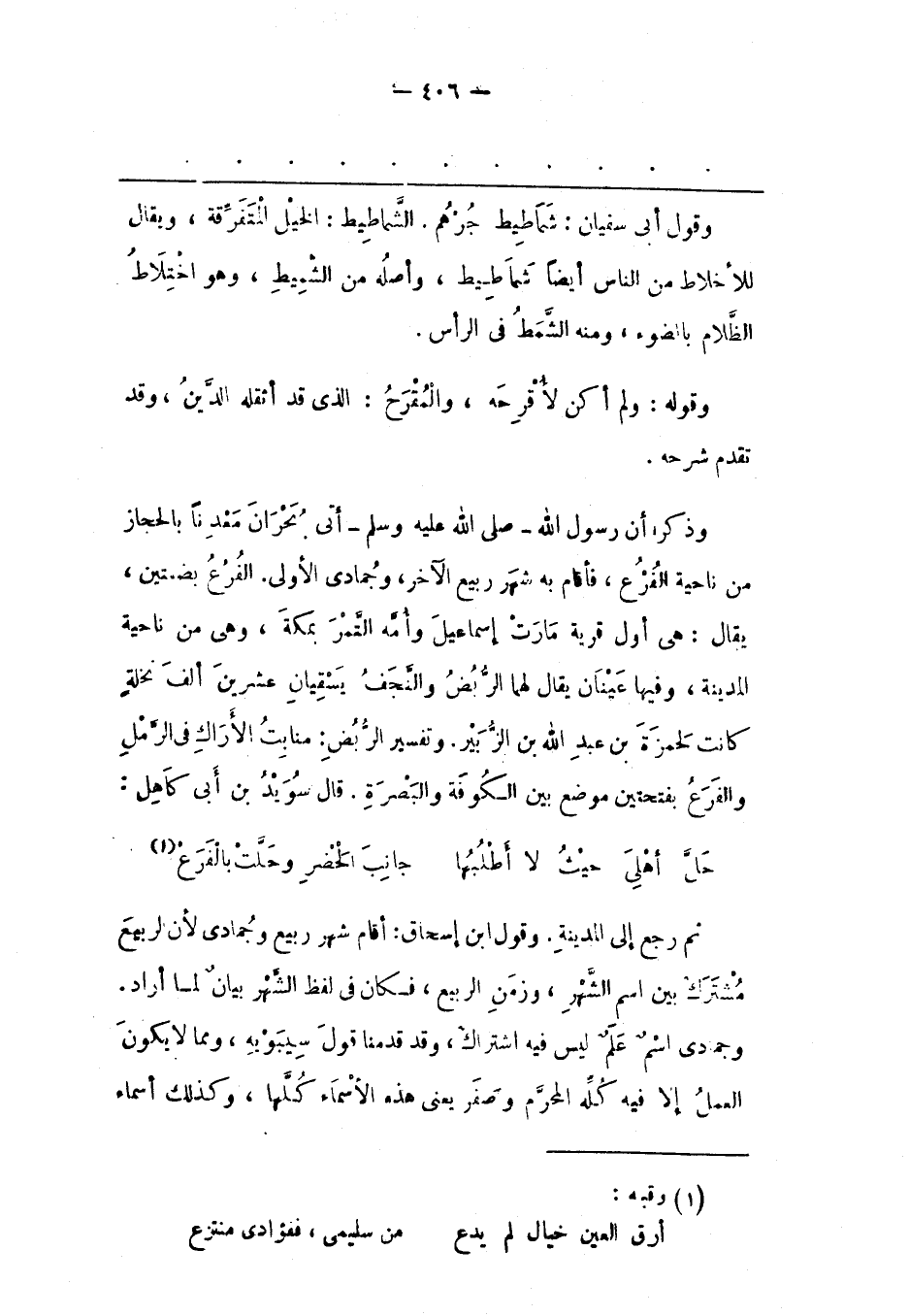 وَذَكَرَ أَنّ رَسُولَ اللهِ- صَلَّى اللَّهُ عَلَيْهِ وَسَلَّمَ- أَتَى بَحْرَانِ مَعْدِنًا بِالْحِجَازِ مِنْ نَاحِيَةِ الْفُرُعِ، فَأَقَامَ بِهِ شَهْرَ رَبِيعٍ الْآخِرَ، وَجُمَادَى الْأُولَى. الْفُرُعُ بِضَمّتَيْنِ، يُقَالُ: هِيَ أَوّلُ قَرْيَةٍ مَارَتْ إسْمَاعِيلَ وَأُمّهُ التّمْرَ بِمَكّةَ، وَهِيَ مِنْ نَاحِيَةِ الْمَدِينَةِ، وَفِيهَا عَيْنَانِ يُقَالُ لَهُمَا الرّبُضُ وَالنّجْفُ يَسْقِيَانِ عِشْرِينَ أَلْفَ نَخْلَةٍ كَانَتْ لِحَمْزَةِ بْنِ عَبْدِ اللهِ بْنِ الزّبَيْرِ. وَتَفْسِيرُ الرّبُضِ: مَنَابِتُ الْأَرَاكِ فِي الرّمْلِ وَالْفَرَعُ بِفَتْحَتَيْنِ مَوْضِعٌ بَيْنَ الْكُوفَةِ وَالْبَصْرَةِ. قَالَ سُوَيْد بْنُ أَبِي كَاهِلٍ: