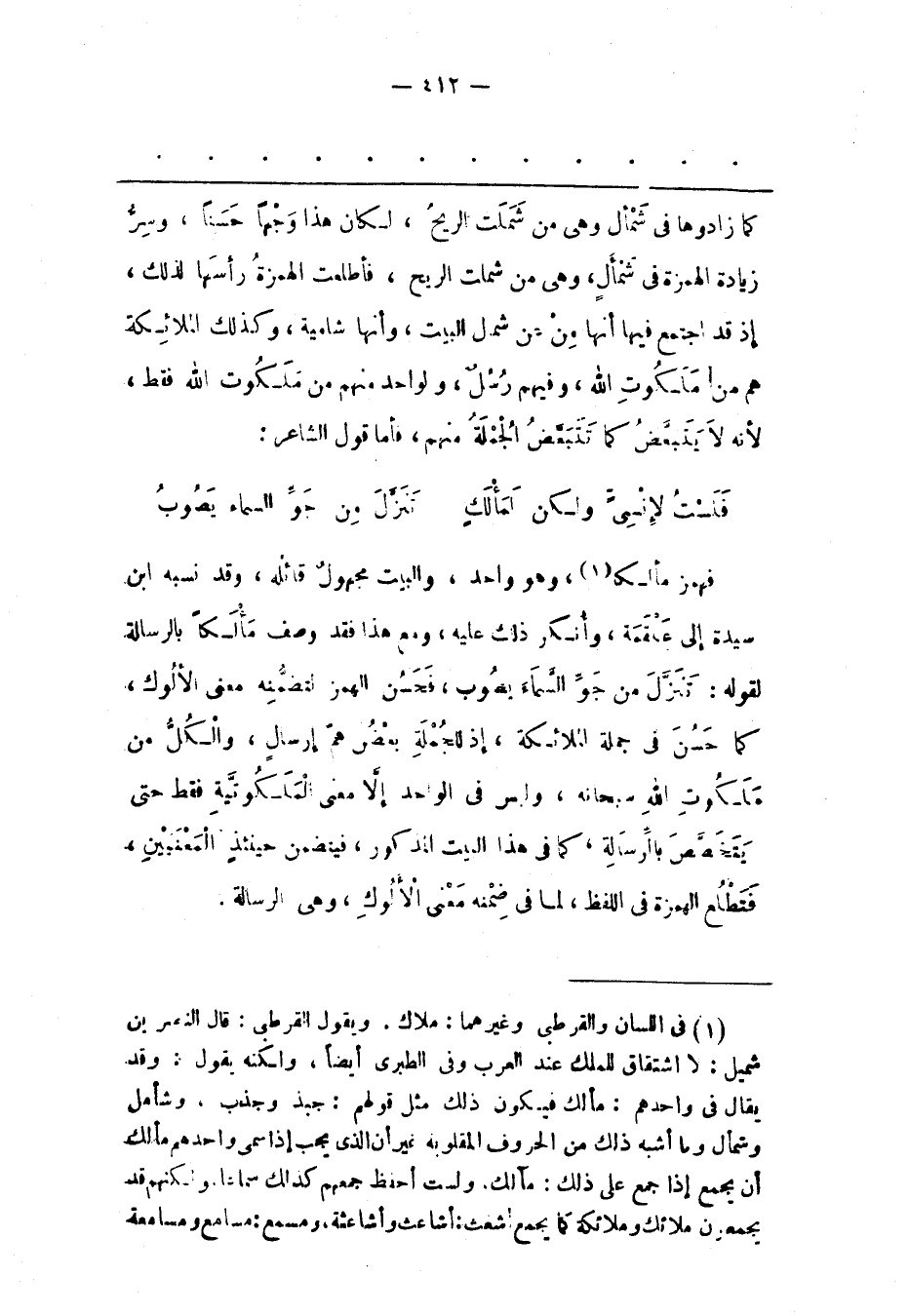 (1) فى اللسان والقرطبى وغيرهما: ملاك. ويقول القرطبى: قال النصر بن شميل: اشتقاق للملك عند العرب وفى الطبرى أيضا، ولكنه يقول: وقد يقال فى واحدهم: مألك فيكون ذلك مثل قولهم: جبذ وجذب، وشأمل وشمأل وما أشبه ذلك من الحروف المقلوبة غير أن الذى يجب إذا سمى واحدهم مألك أن يجمع إذا جمع على ذلك: مآلك. ولست أحفظ جمعهم كذلك سماعا ولكنهم قد يجمعون ملائك وملائكة كما يجمع اشعث: أشاعث وأشاعثة، ومسمع: مسامع ومسامعة