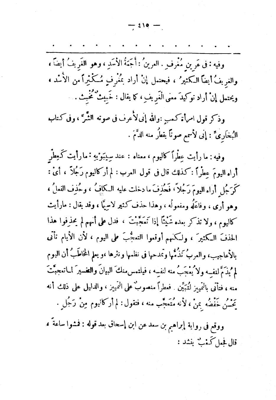 وَفِيهِ: مَا رَأَيْت عِطْرًا كَالْيَوْمِ، مَعْنَاهُ: عِنْدَ سِيبَوَيْهِ: مَا رَأَيْت كَعِطْرِ أَرَاهُ الْيَوْمَ عِطْرًا: كَذَلِكَ قَالَ فِي قَوْلِ الْعَرَبِ: لَمْ أَرَ كَالْيَوْمِ رَجُلًا، أَيْ: