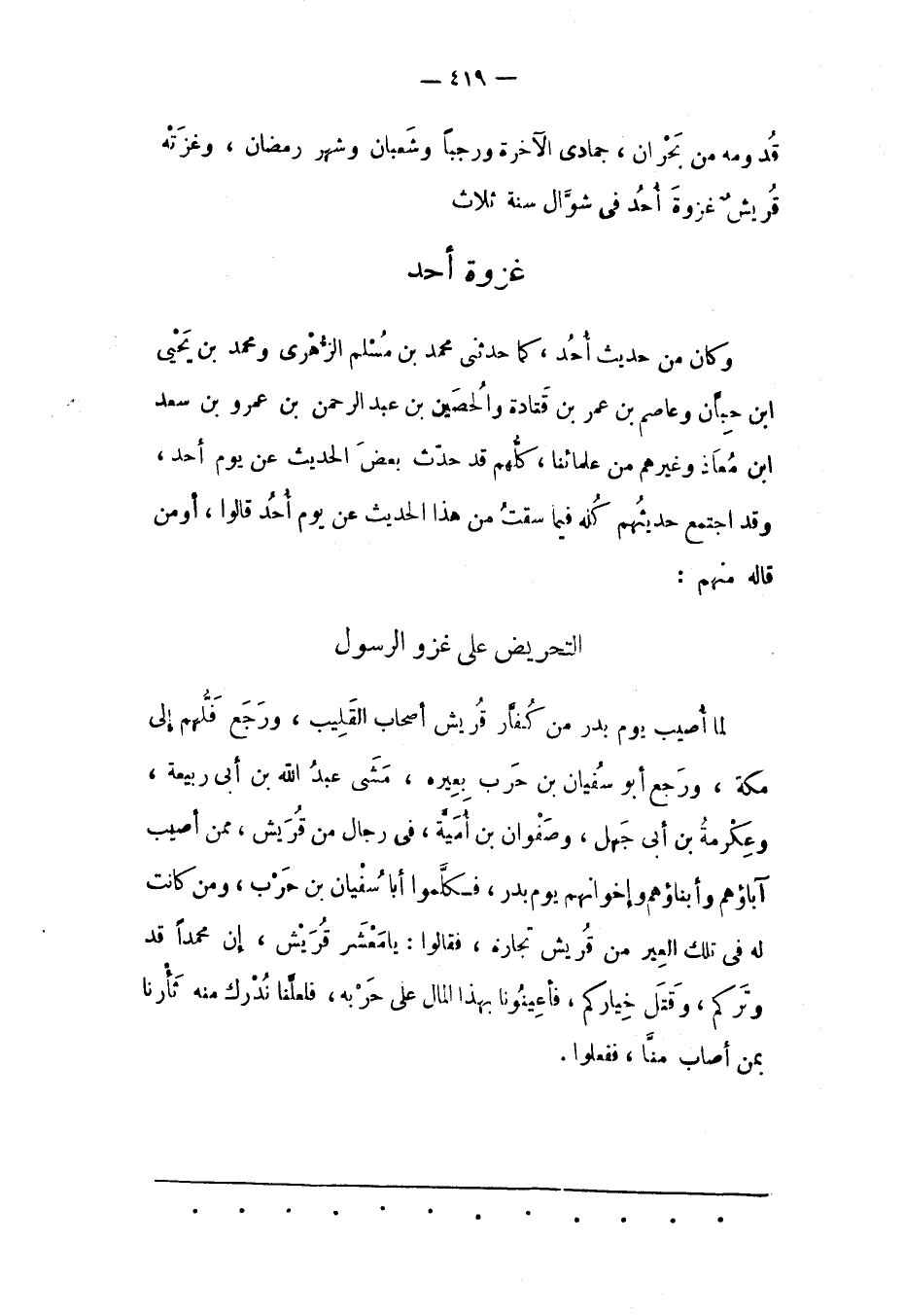 وَكَانَ مِنْ حَدِيثِ أُحُدٍ، كَمَا حَدّثَنِي مُحَمّدُ بْنُ مُسْلِمٍ الزّهْرِيّ وَمُحَمّدُ بْنُ يحيى ابن حِبّانَ وَعَاصِمُ بْنُ عُمَرَ بْنِ قَتَادَةَ وَالْحُصَيْنُ بْنُ عَبْدِ الرّحْمَنِ بْنِ عَمْرِو بْنِ سَعْدِ ابن مُعَاذٍ وَغَيْرُهُمْ مِنْ عُلَمَائِنَا، كُلّهُمْ قَدْ حَدّثَ بَعْضَ الْحَدِيثِ عَنْ يَوْمِ أُحُدٍ، وَقَدْ اجْتَمَعَ حَدِيثُهُمْ كُلّهُ فِيمَا سُقْتُ مِنْ هَذَا الْحَدِيثِ عَنْ يَوْمِ أُحُدٍ قَالُوا، أَوْ مَنْ قَالَهُ منهم: